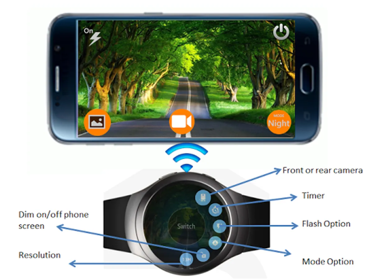 - Setting options for camera from gear: Mode, Flash, Timer, Dim off Screen... more and more