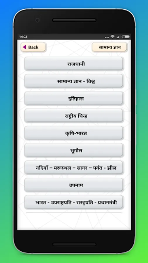 It’s a general knowledge Indian version where you will get all question and answer on Hindi. So you can tell it as India gk book in Hindi or gk in Hindi book. It includes world’s different affairs, Indian affairs, capital of different country, Geography, Sports, Agriculture etc. So it is a complete general knowledge India app. General knowledge history is also included. We will try to add more topic on next update.