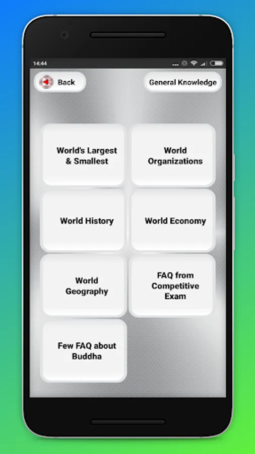 It’s a general knowledge Indian version app where you will get all question and answer on English. So you can tell it as India gk world book in English or gk world in English book. It includes world’s different affairs, World's Largest & Smallest place or river, mountain, falls etc. Also different topic like World Organizations, World History, World Economy and Geography are included here. FAQ from Competitive Exam is a bonus of this app. At last point you will get different question and answer about the greatest Buddha. So it’s a complete general knowledge World GK type Indian app. We will try to add more topic on next update.