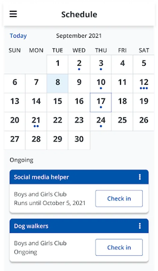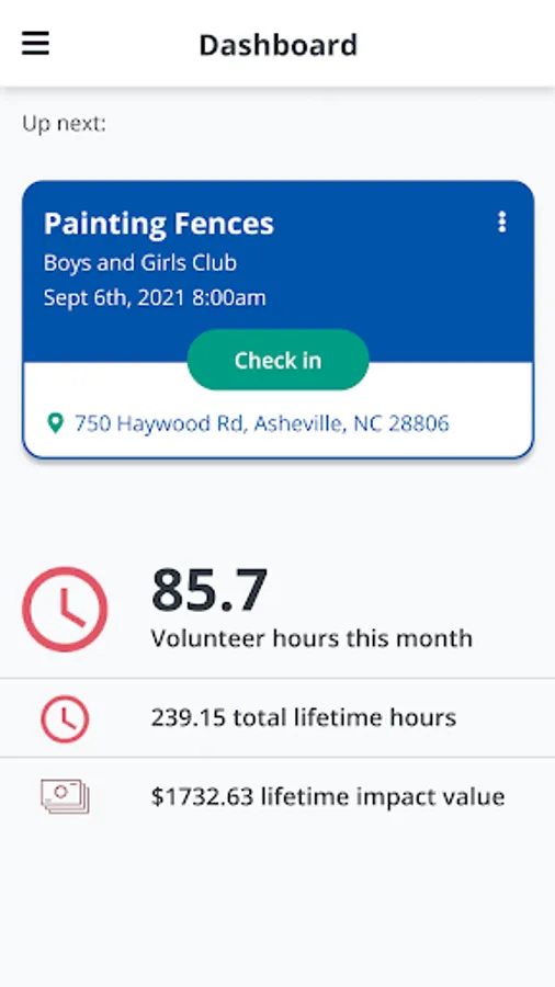 You can check in directly from the app when you begin volunteering to ensure your program is able to collect your volunteer hours - data that helps make a bigger difference!