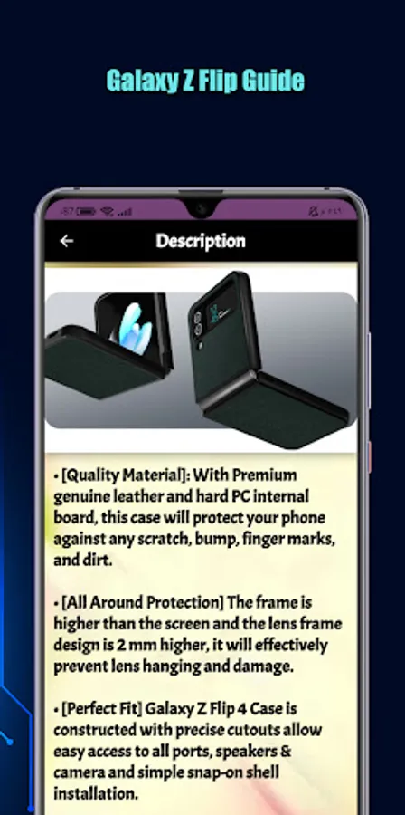 + Contains many pictures to see all designs of galaxy z flip guide .