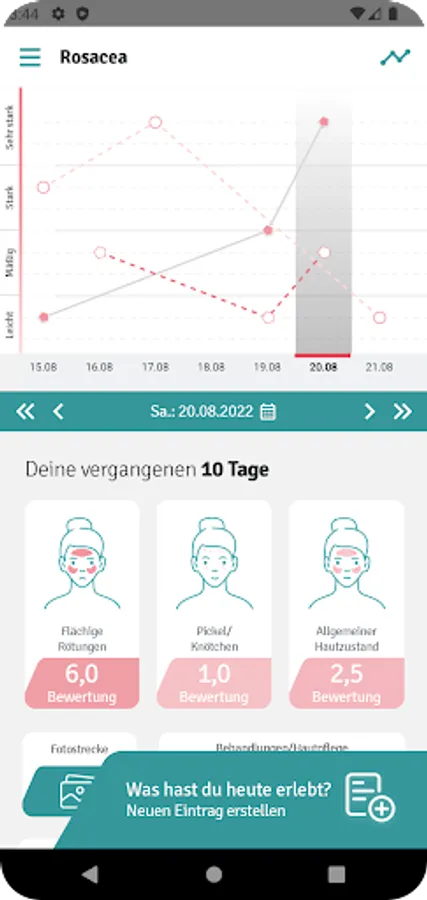 Sonne, Lebensmittel, Pflegeprodukte, Stress: Dokumentiere, was du im Alltag erlebst und identifiziere deine persönlichen Trigger. Das Dashboard gibt dir einen Überblick über deine letzten 7 Tage und hilft dir dabei, deine Rosacea im Auge zu behalten. So kannst du Schübe und Hautrötungen besser in den Griff bekommen – schnell und unkompliziert.