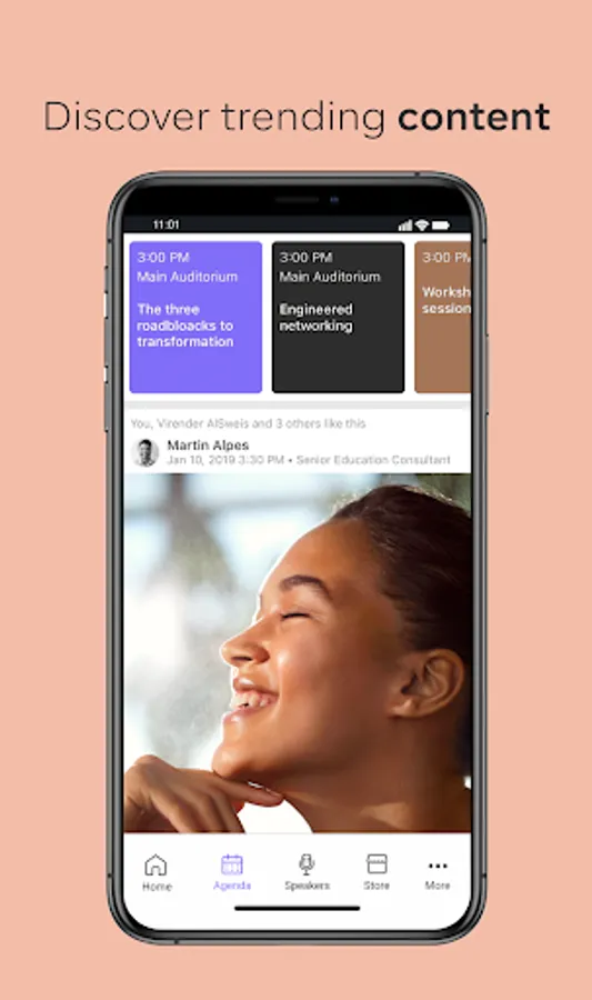 - Networking: instant messaging with delegates, exchange of digital business cards, access to attendee lists.