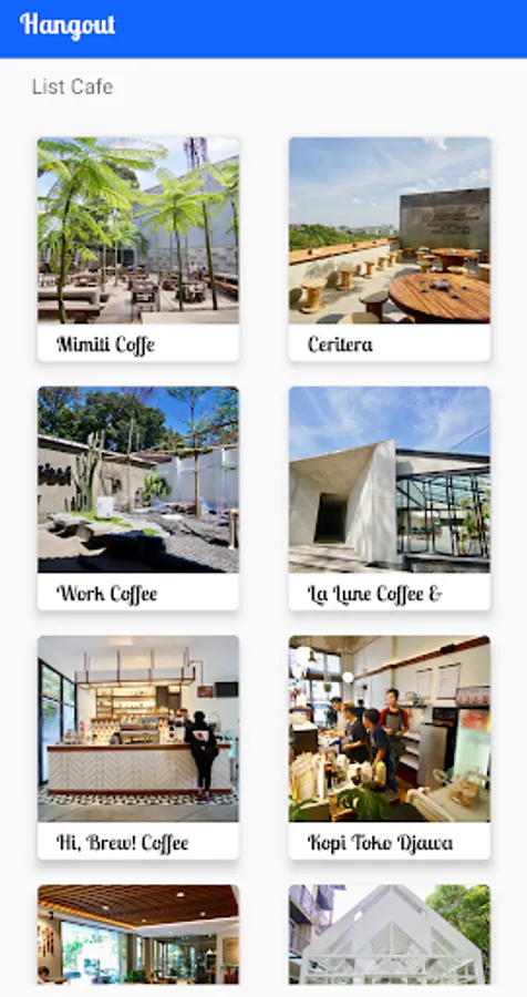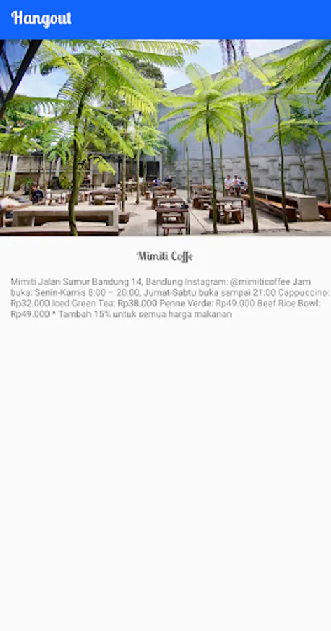 This application is an application to search for cafes located in Bandung, along with the address of the café, opening and closing hours, prices of food and drinks.