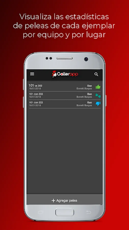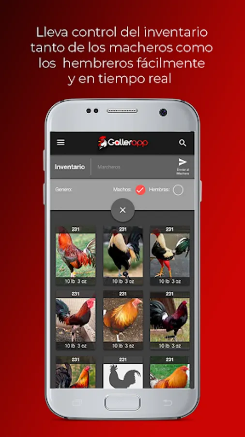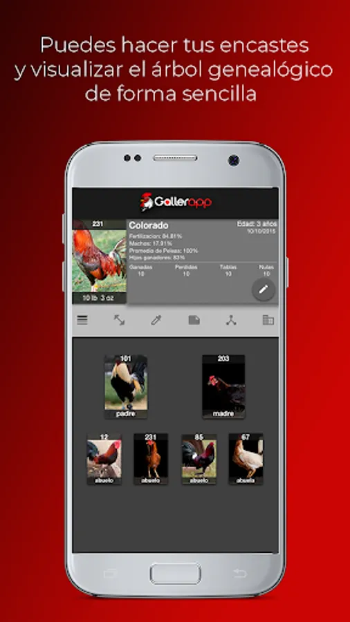 Gallerapp proporciona todas las funcionalidades que requiere un gallero campeón: cruces, manejo de inventario, ranking de padres, registro de entrenamientos, peleas, vacunas, pedigree, estadísticas, traslados, manejo de almacenes, equipo y mucho más!
