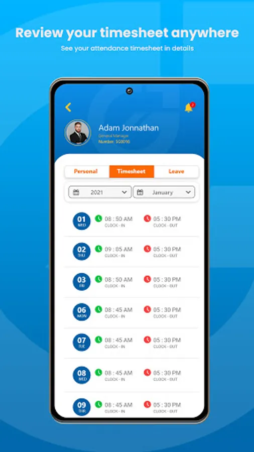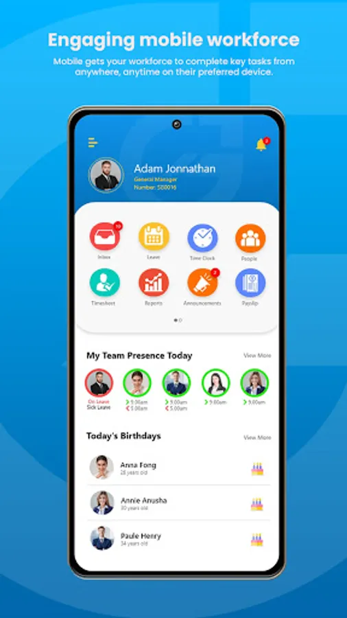 • Review your team, view or request leave, check in and out for work, view your timesheet, and leave balance and history.