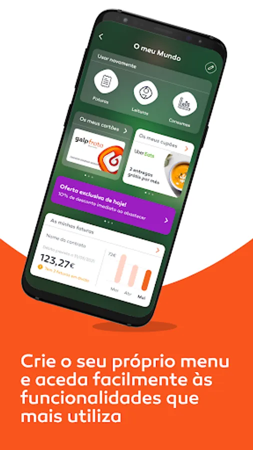 In the Mundo Galp app, you can manage all your electricity and natural gas contracts, check your energy bills and send your readings. Consult all your activity with Galp, consumption and savings, whether electricity and natural gas, or gasoline and diesel at our gas stations.