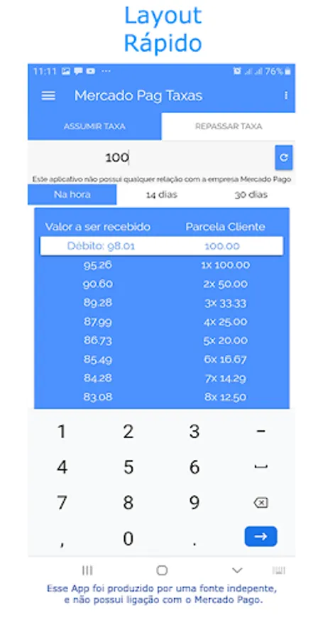 Whenever you choose to pass the rates to the customer, the seller option must be chosen on the machine at the time of sale, then you only enter the amount presented in the application in the Mercado Pago Fees application, and in the end you receive the value of the sale.