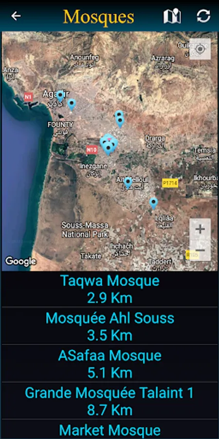 List and map of nearby mosques
