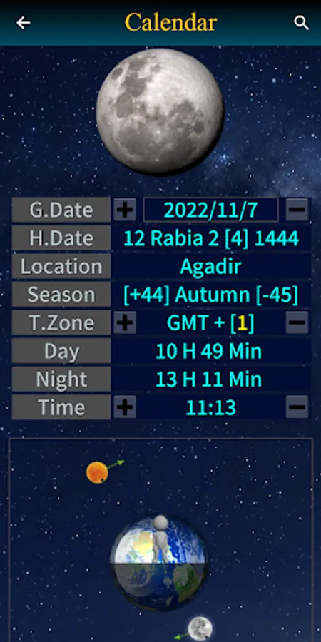 Times of sunrise and sunset for both the sun and the moon