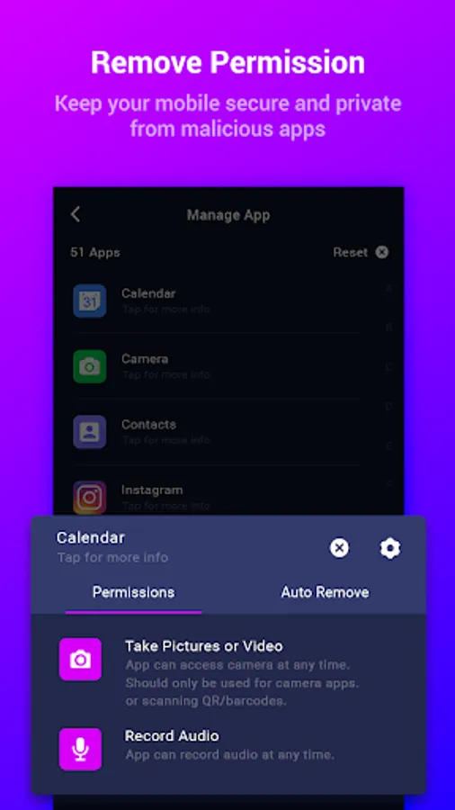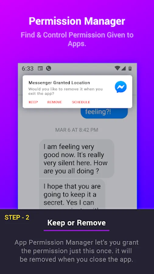 We know that your privacy and security is one of the most important things in terms of control and knowledge. Permission Manager gives you the power to be always informed and to have the ability to control without you even knowing with your most sensitive information, like location, contacts, camera and even microphone. It gives you the ability to grant permissions temporarily. As soon as you exit the app, Permission Manager Will automatically remove the permission for you in an instant so you can get back to doing what you do best, without having to worry about apps invading your privacy and wasting your battery.