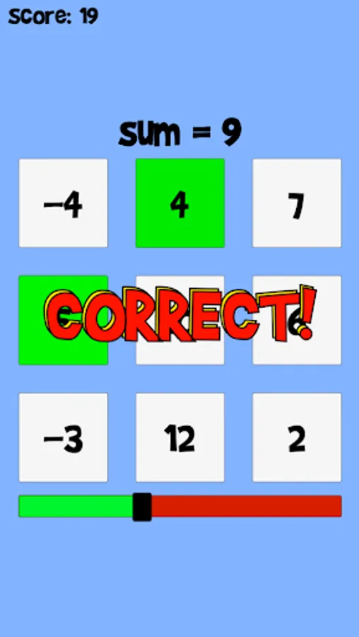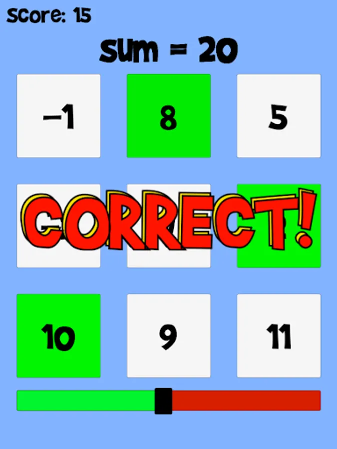 This part of MadMath: Cool Math Games will train your addition skills. Your target is to select numbers whose sum forms a given number on the top of the screen. Numbers can be selected and deselected by tapping them. When the sum of selected numbers matches the given value you get some more score and new given result appears. There is a time limit for each assignment, so think and select quickly!