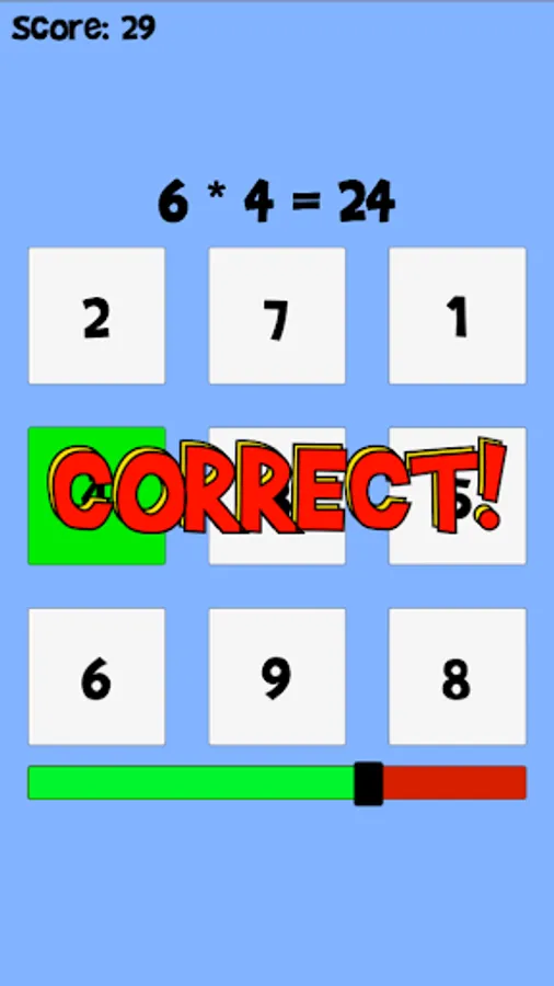 This part of MadMath: Cool Math Games is targeted to train your multiplication skills (1 to 9). Given result is shown on the top of the screen and your target is to select one number which, multiplied by another number, forms a given result. There is a time limit for each assignment. Wrong answer ends the game. So, be quick and select your number carefully!