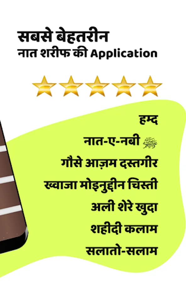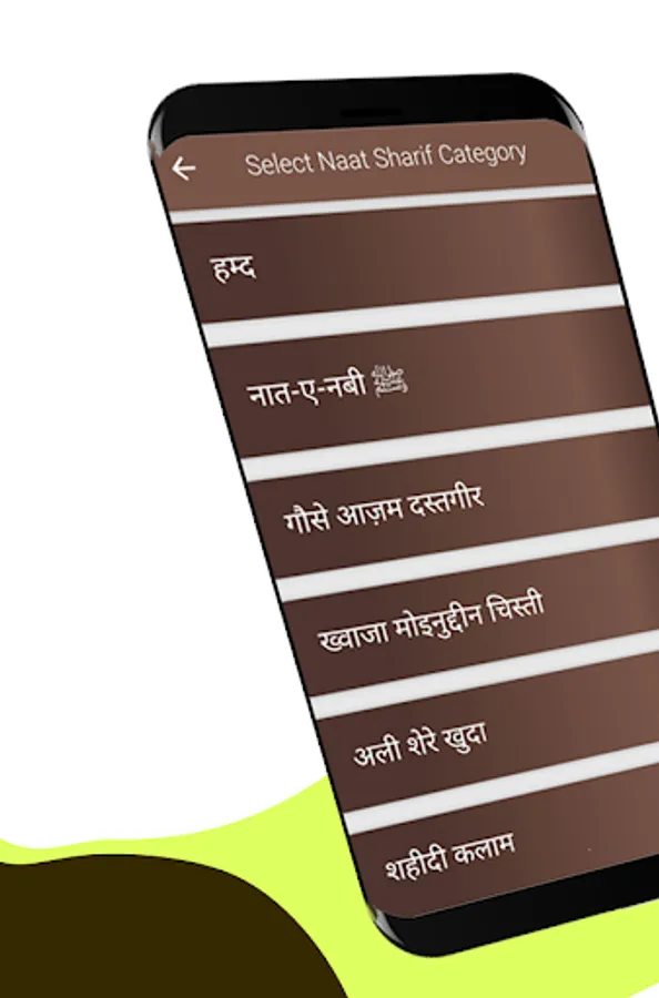 In this application you will see an option to view list of Naat Sharif Category, when you click an option to view categories, you will see list of Naat Sharif's category in Hindi.