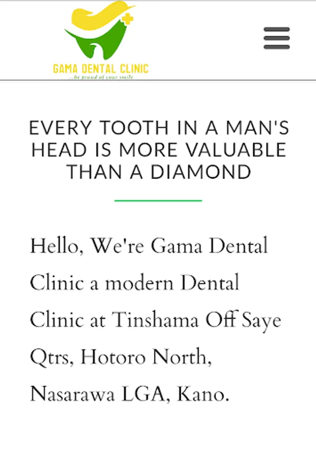 The official clinic nomenclature is ‘GAMA & DENTAL CLINIC where “GAMA DENTAL CLINIC” is often used in our signposts. The clinic got its name from proprietor’s place of origin (DR AUWALU ADAMU ABUBAKAR, Medical Director) I.e. “GAMA ”a ward sited at Brigade quarters, Nasarawa local government area, Kano.