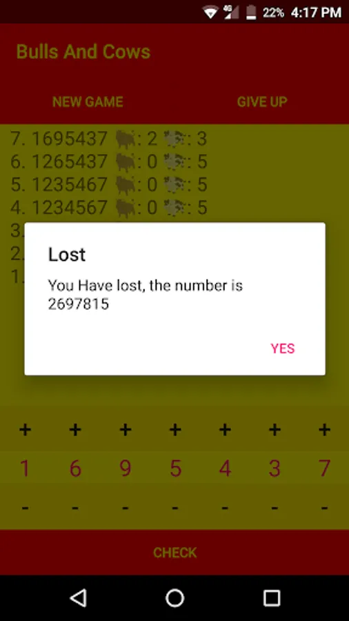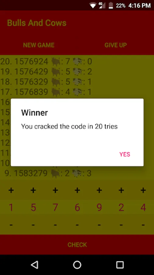 The Bulls & Cows - Code Cracker Game is a logical game of guessing the numbers equal to the generated code. The goal is to check the number generated by the app and figure out the code. The Bulls indicate the correct number placed at correct position and the Cows indicate the correct number placed at wrong position. You also have the opportunity to customise your own app layout.