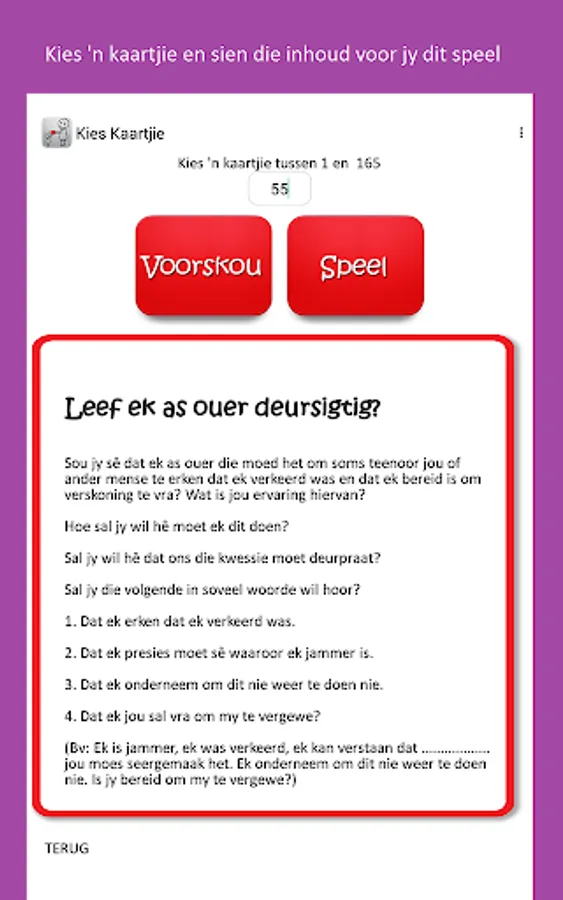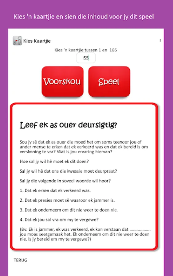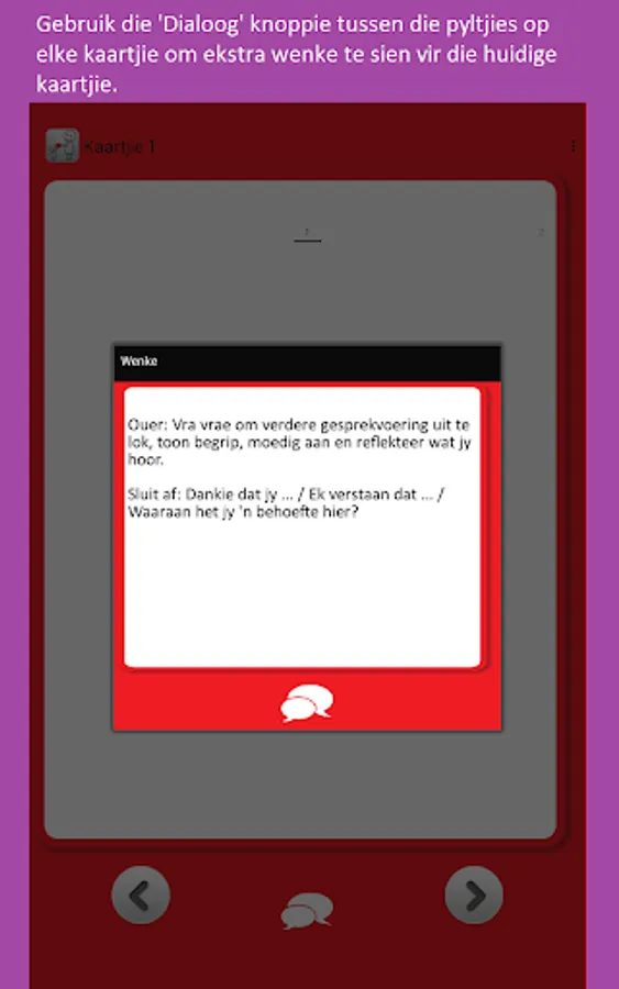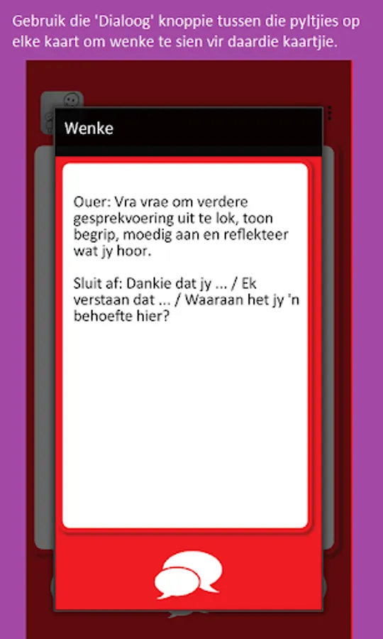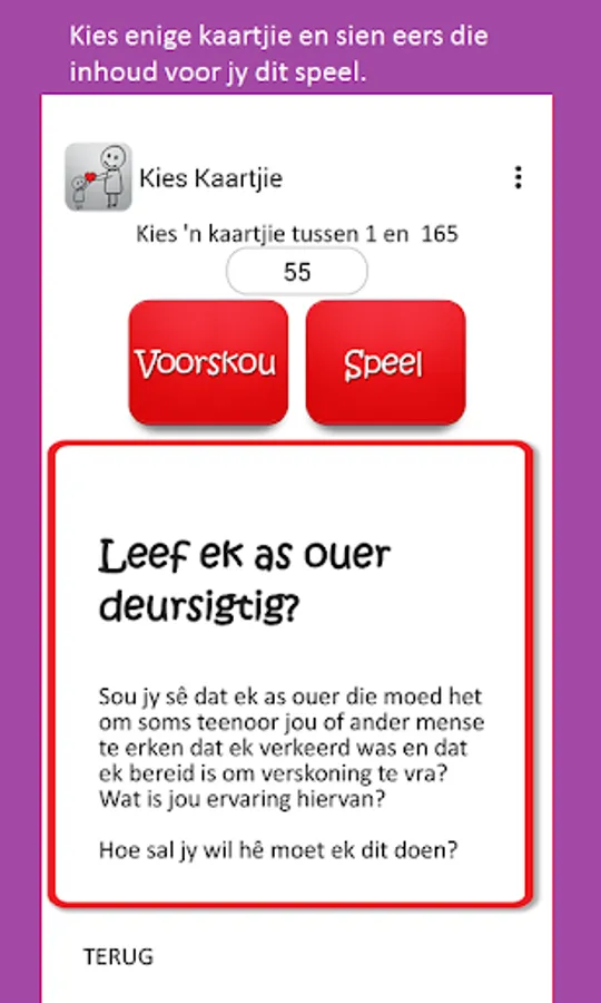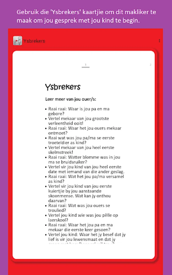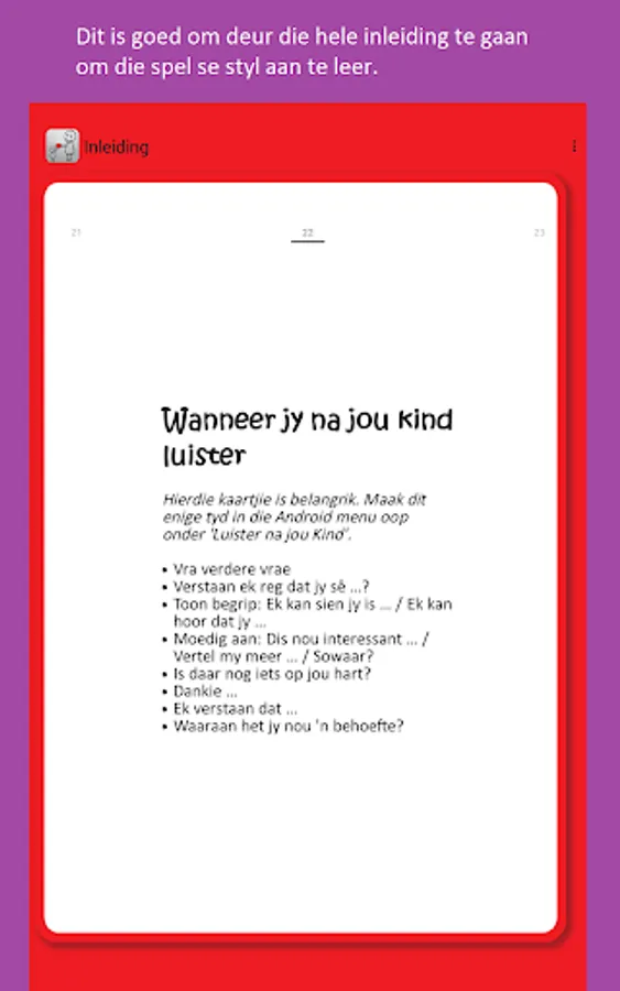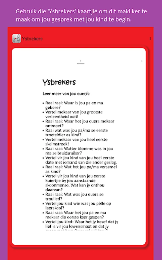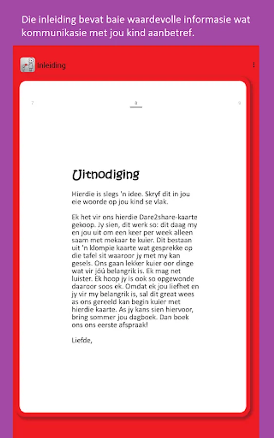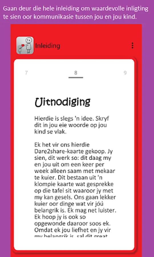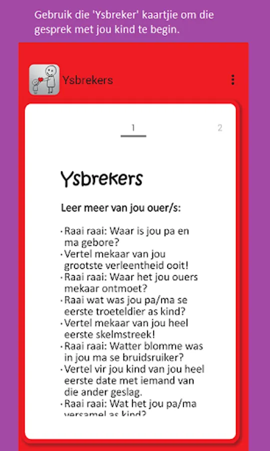 Hierdie app daag ouers uit om konflik-vrye alleentyd met hulle kinders deur te bring op 'n individuele basis. Die kaarte skep 'n platform waar jou kinders hulle eerlike opinies, behoeftes, en gevoelens kan kommunikeer.
