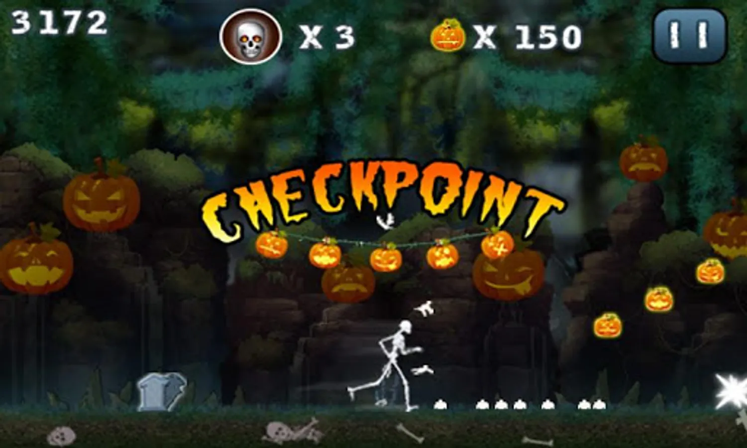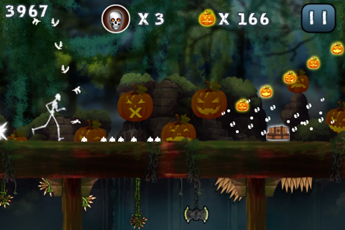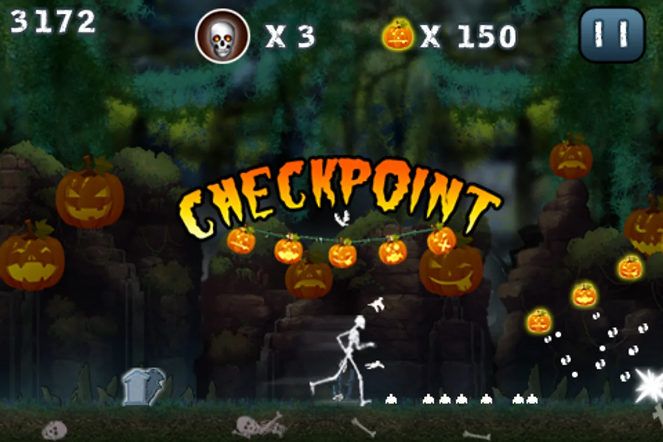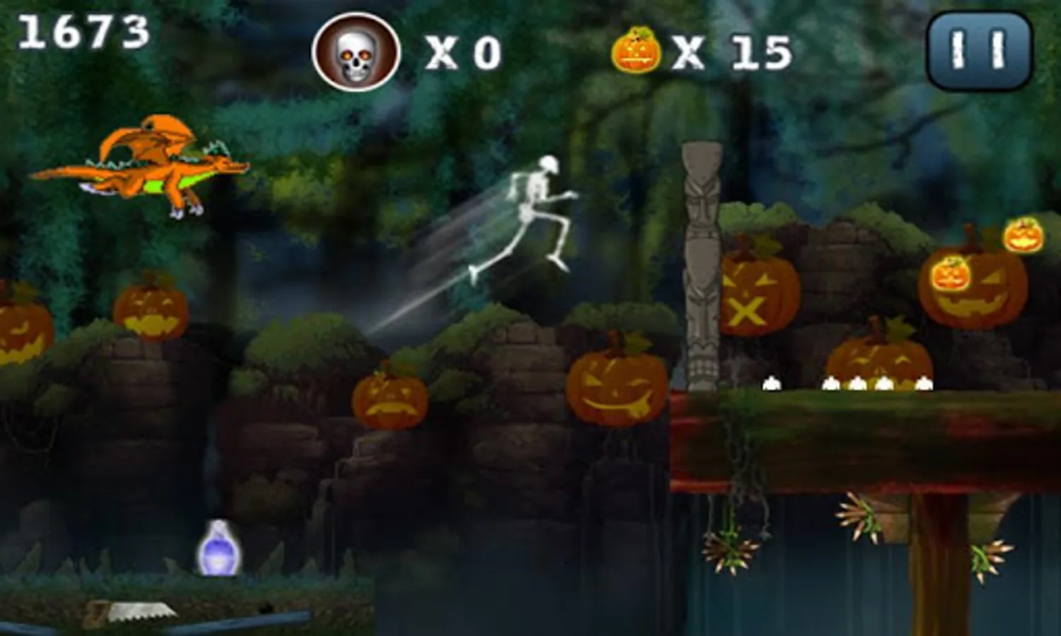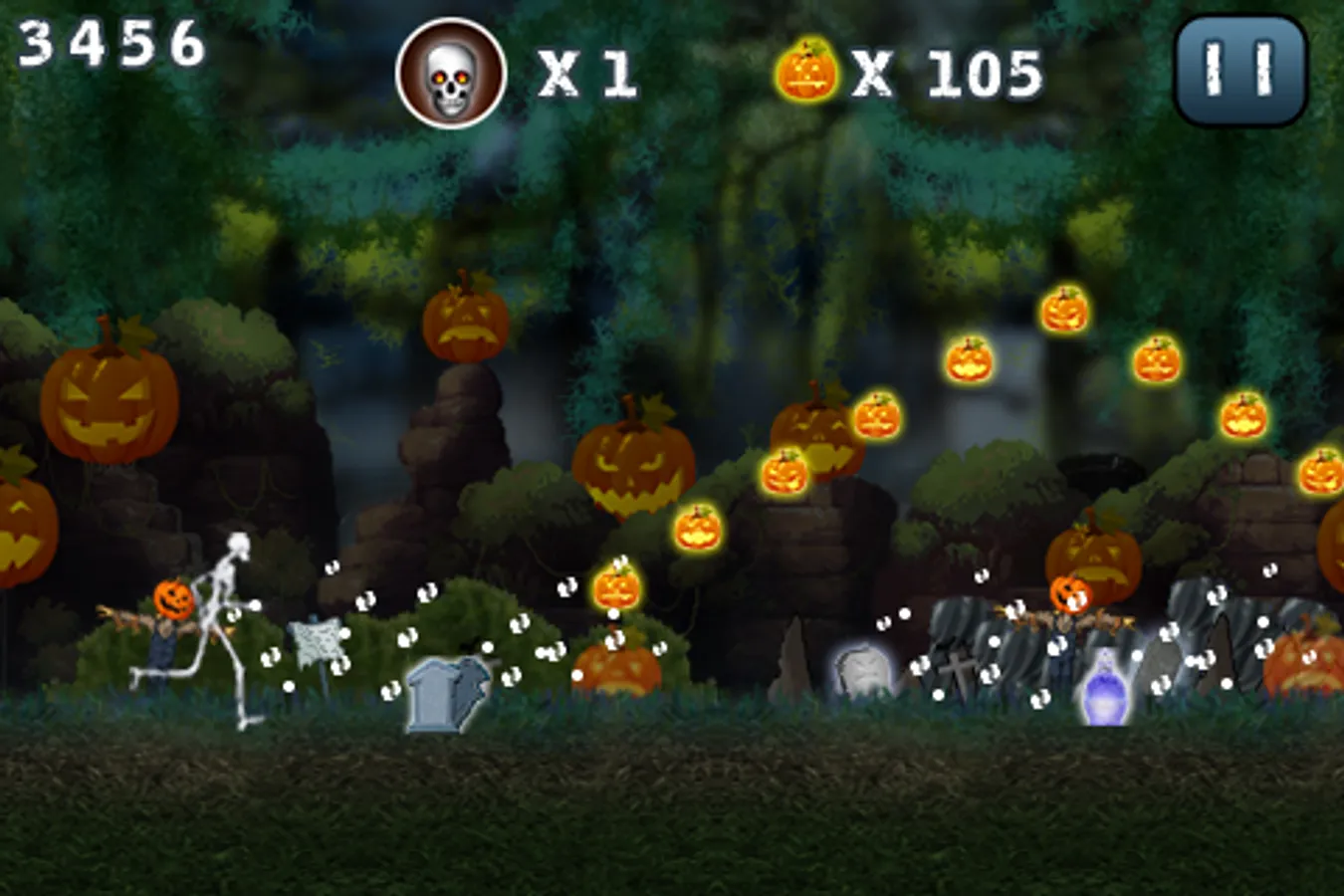 Halloween Jungle Run is an endless running game with terrific backgrounds, coffins, ghosts, holy water, spiders, witches, pumpkins and more. The bone man is on the way to jungle and wants to become the best runner out of the world. Help him to control the jump and avoid the hurdles coming the way. Double tap to jump high. Collect all the pumpkins to score high and high, beware of divine spirit and holy water which will lead to end the journey. Also you have to take care of the coffin, magic stones and grave stones, which will slow down the speed. Get an extra chance to run more far at every check-point.