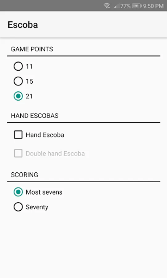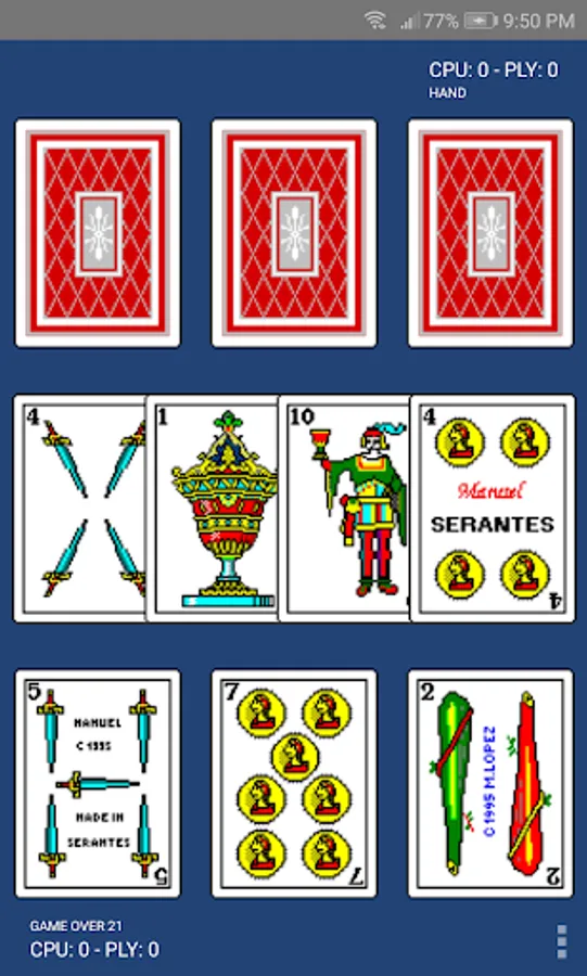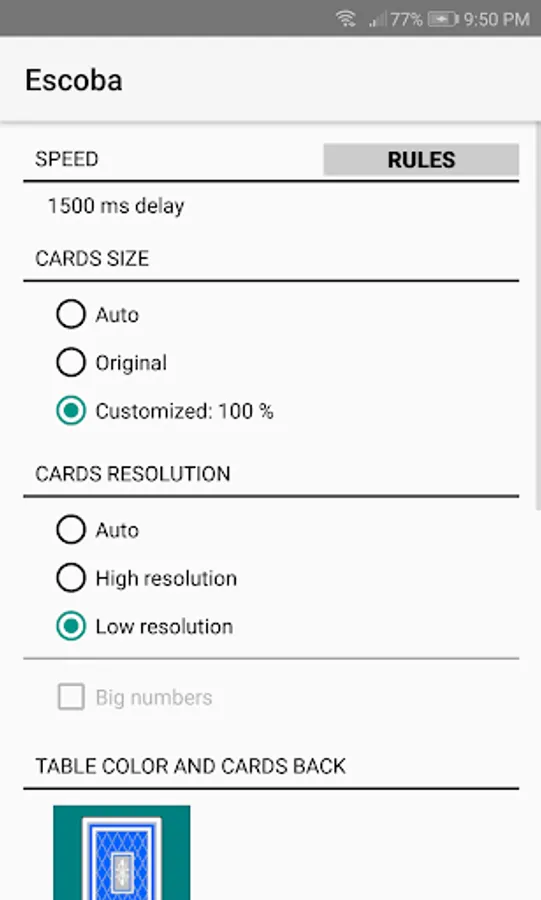 - Settings: Cards size and resolution, cards back color, sound, scoreboards, table and scores color, cards numbers size, animations,...