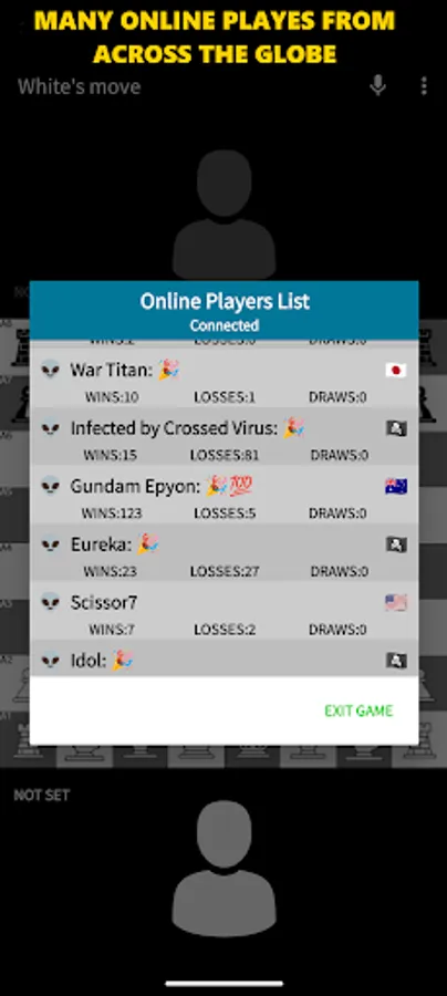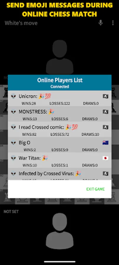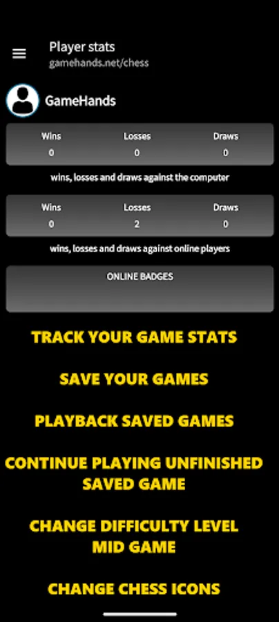 • Player stats: Helps monitor your progress by automatically recording your wins, losses and drawers you have against the computer and against online players.
