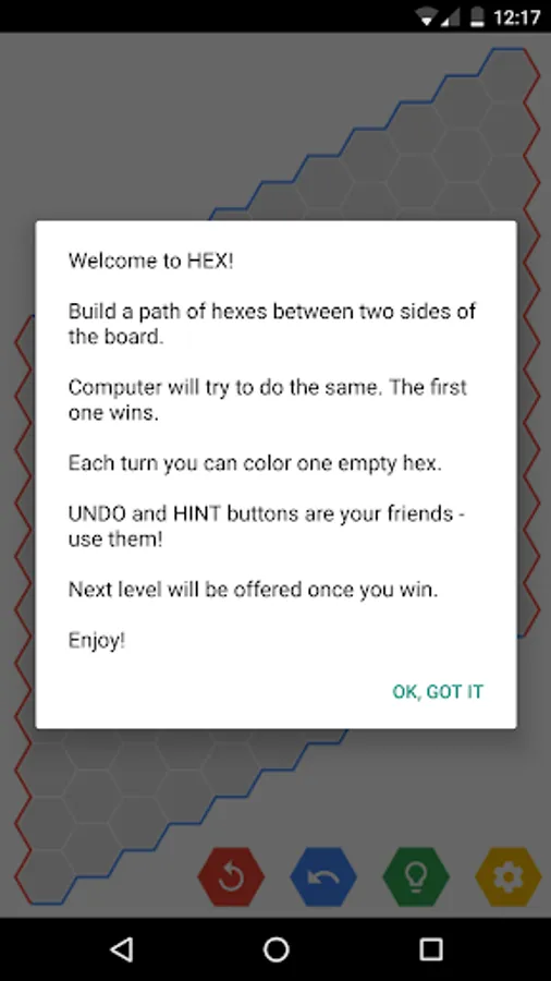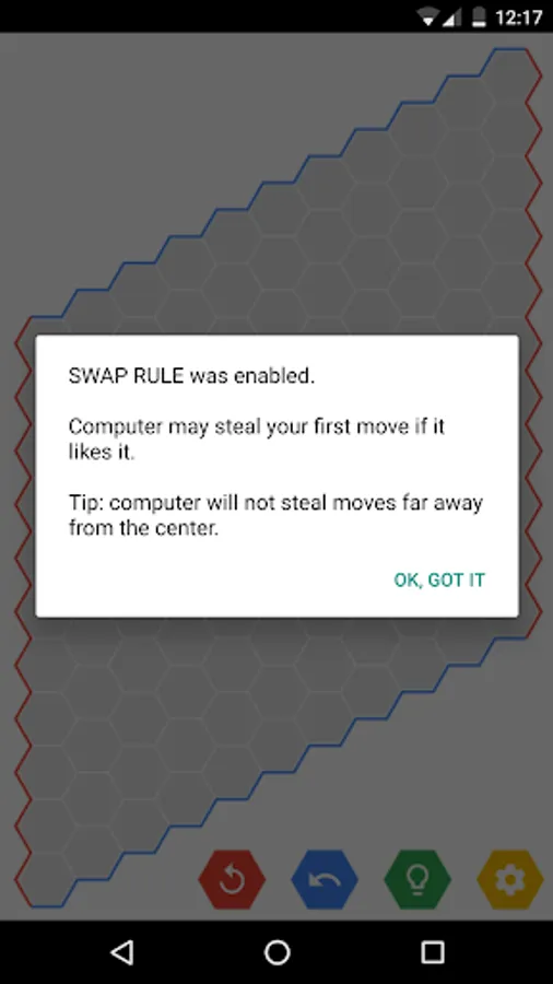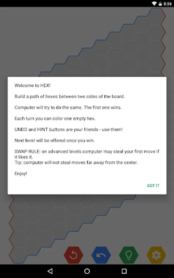 The game is very easy to start, but hard to master. Try to win against the computer engine provided by this app. If you do not like your last move(s), feel free to use the undo button. Using settings increase complexity level, enable swap rule, allow the computer to make first move (with or without swap rule). If you want to learn the best moves try the hint button.