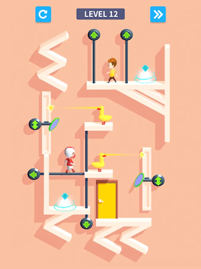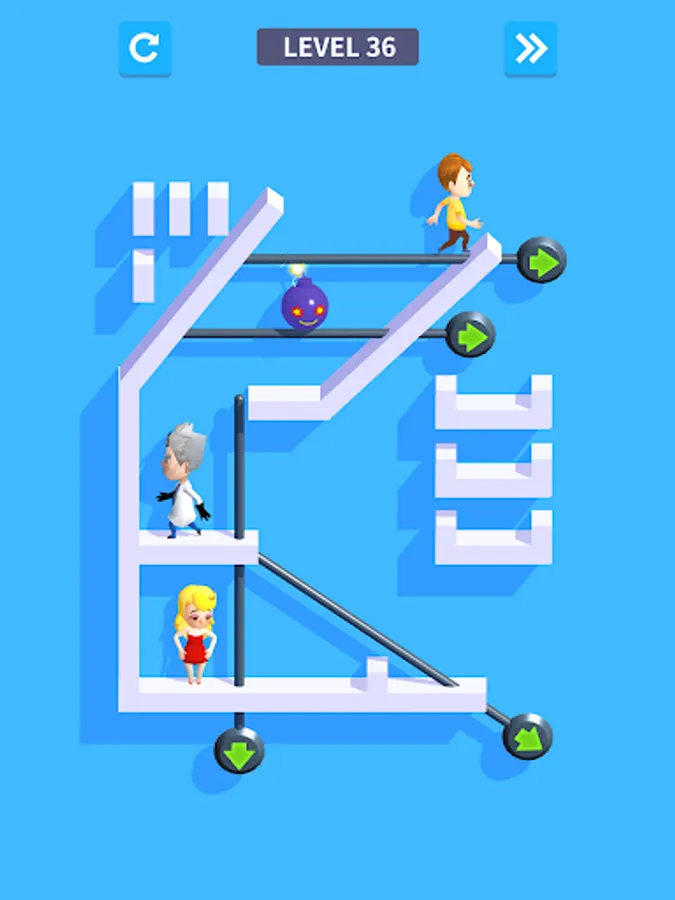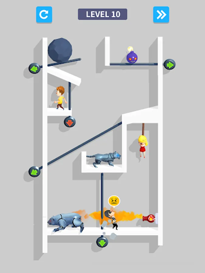 YOU gotta SAVE YOURSELF, and GET to SAFETY! PIN your way to VICTORY! ESCAPE and SOLVE with that BIG BRAIN of yours! Watch out for ROBOT ANIMALS! ROAR! They are MALFUNCTIONING and going to DESTROY ALL HUMANS! The MAD SCIENTIST has gone TOO FAR! WHOA! Stay away from BOMBS! GET the GIRL of your DREAMS from EVIL MACHINES! Protect her from the THIEF and ESCAPE!