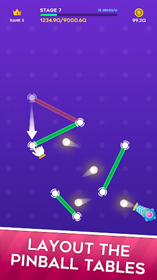 Set up a pinball table and earn money by making the ball bounce on ropes!