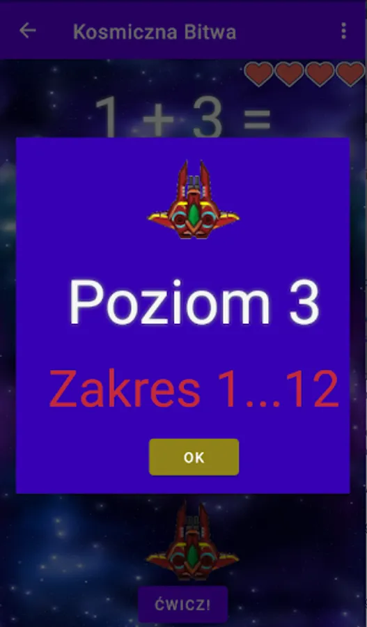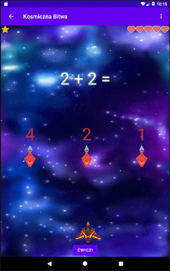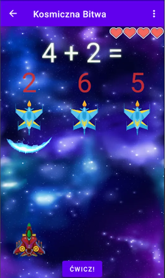 Once you've mastered the basics, it's time for the exciting space battle stage! Here you will be able to test your knowledge and skills by destroying enemy ships. Each of these ships is responsible for the correct answer to the following mathematical operations. Many levels await you, each of which brings new challenges in the form of more difficult activities. You can be sure that every victory in a space battle is a great satisfaction!