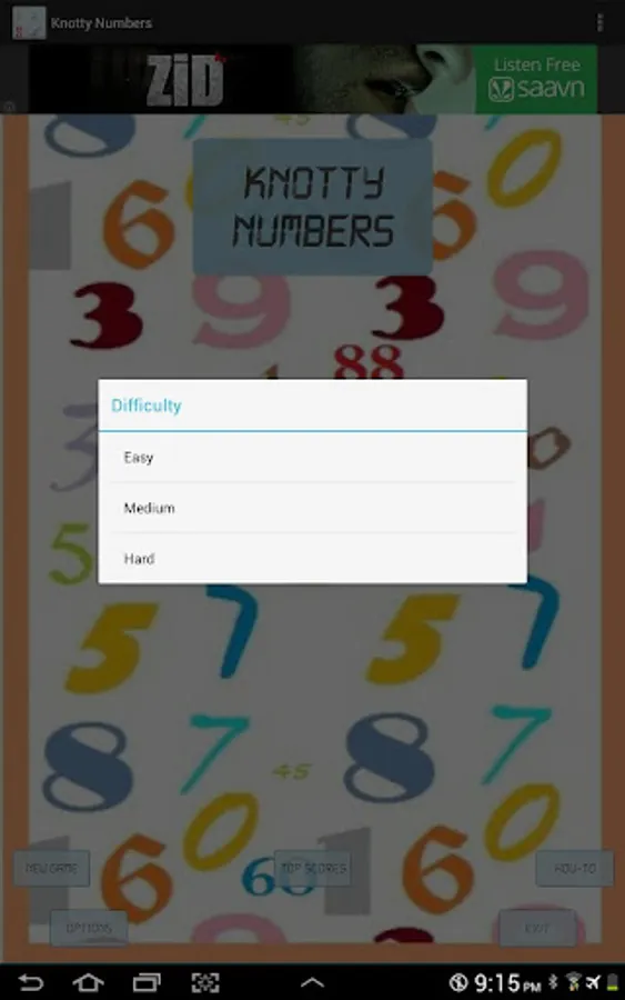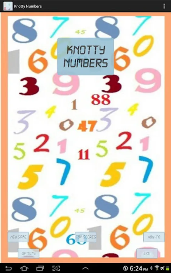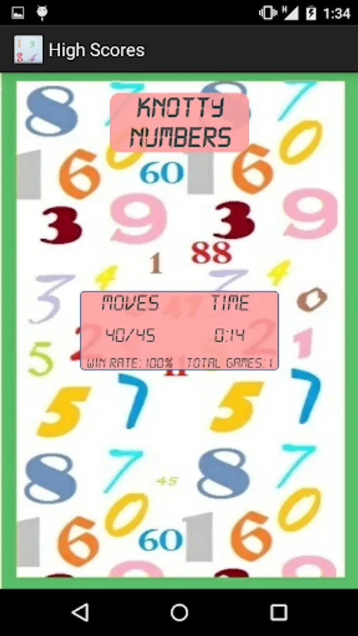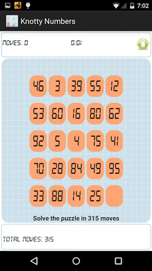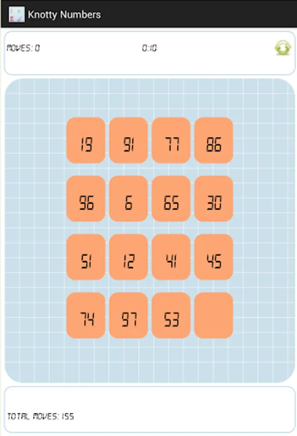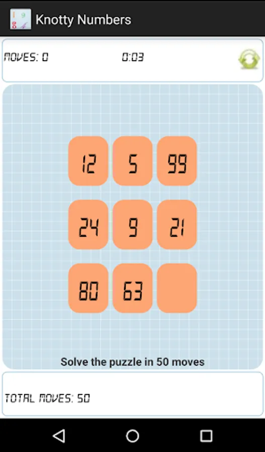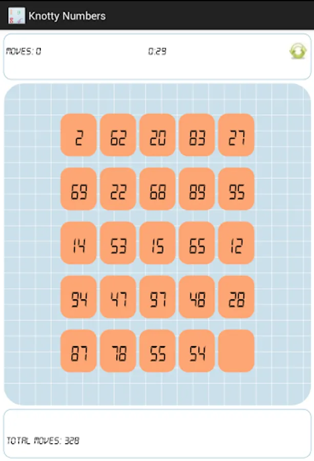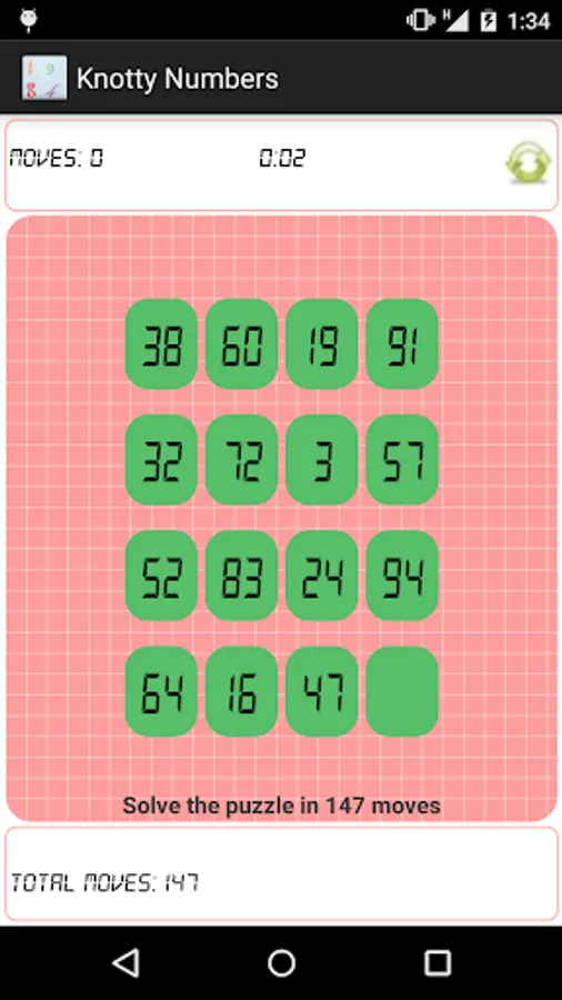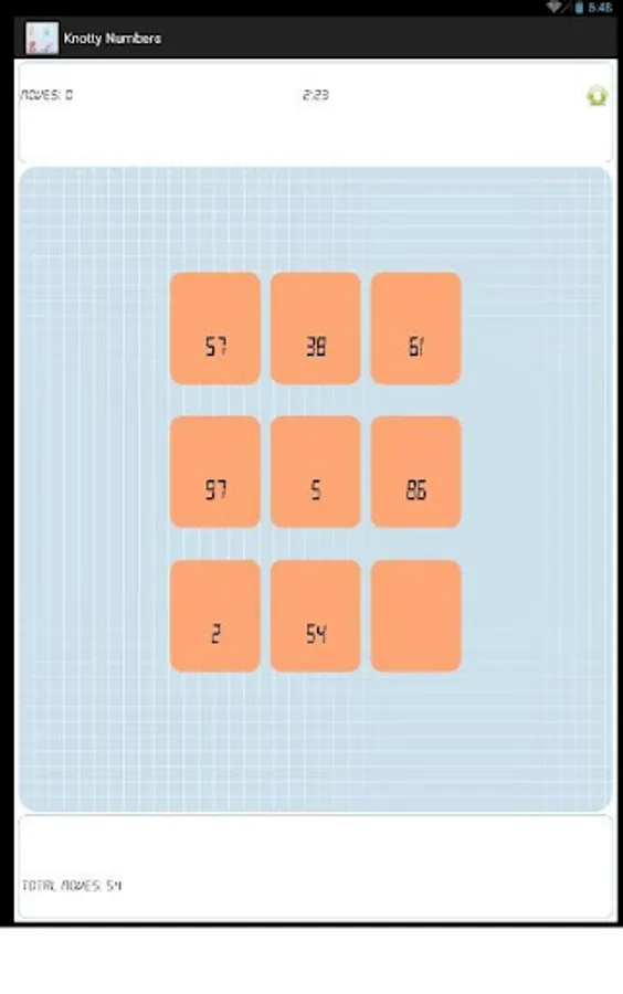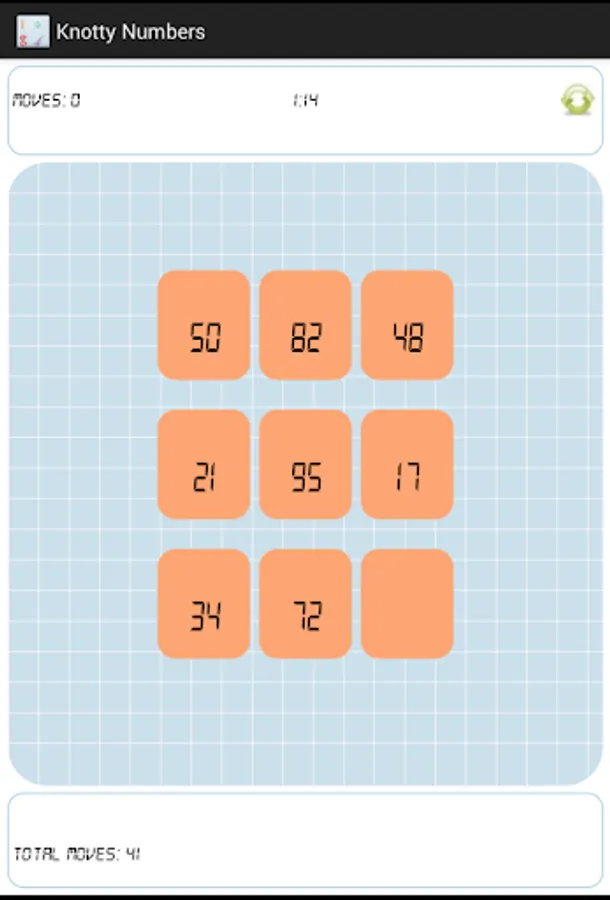 Knotty Numbers is a number based game with an objective of lining up the jumbled numbers from smallest to largest. The numbers are presented to the user in a grid with one blank tile. The blank tile can be used as a holding bay in the process of arranging the numbers. Each puzzle presented to the user is verified to be solvable.