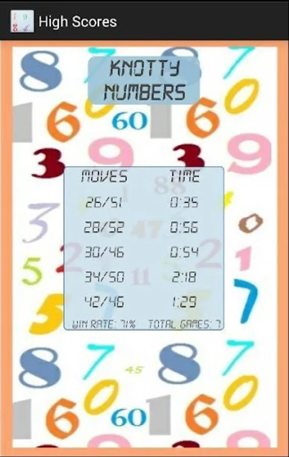 Scores are kept separately for each mode and level. User is presented with the moves or time taken for the top 10 games. There is also a summary of the scores which presents the win rate and total number of games played till date.