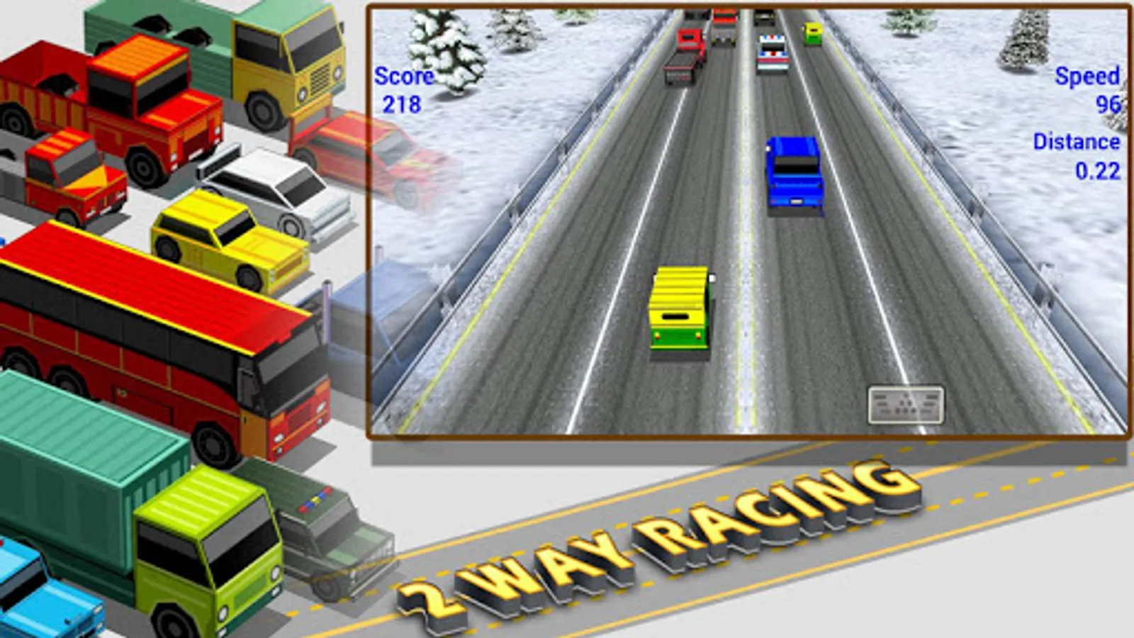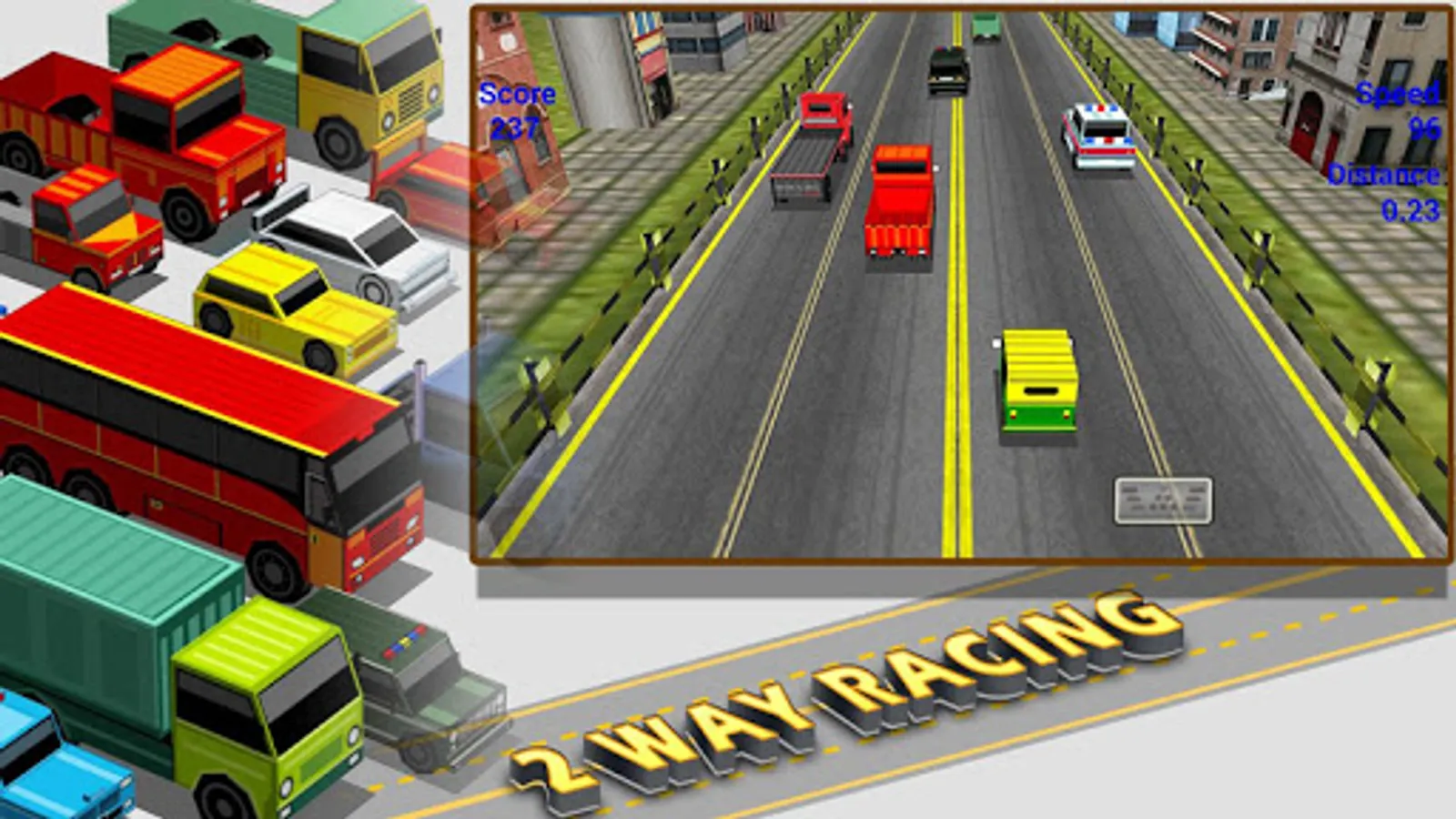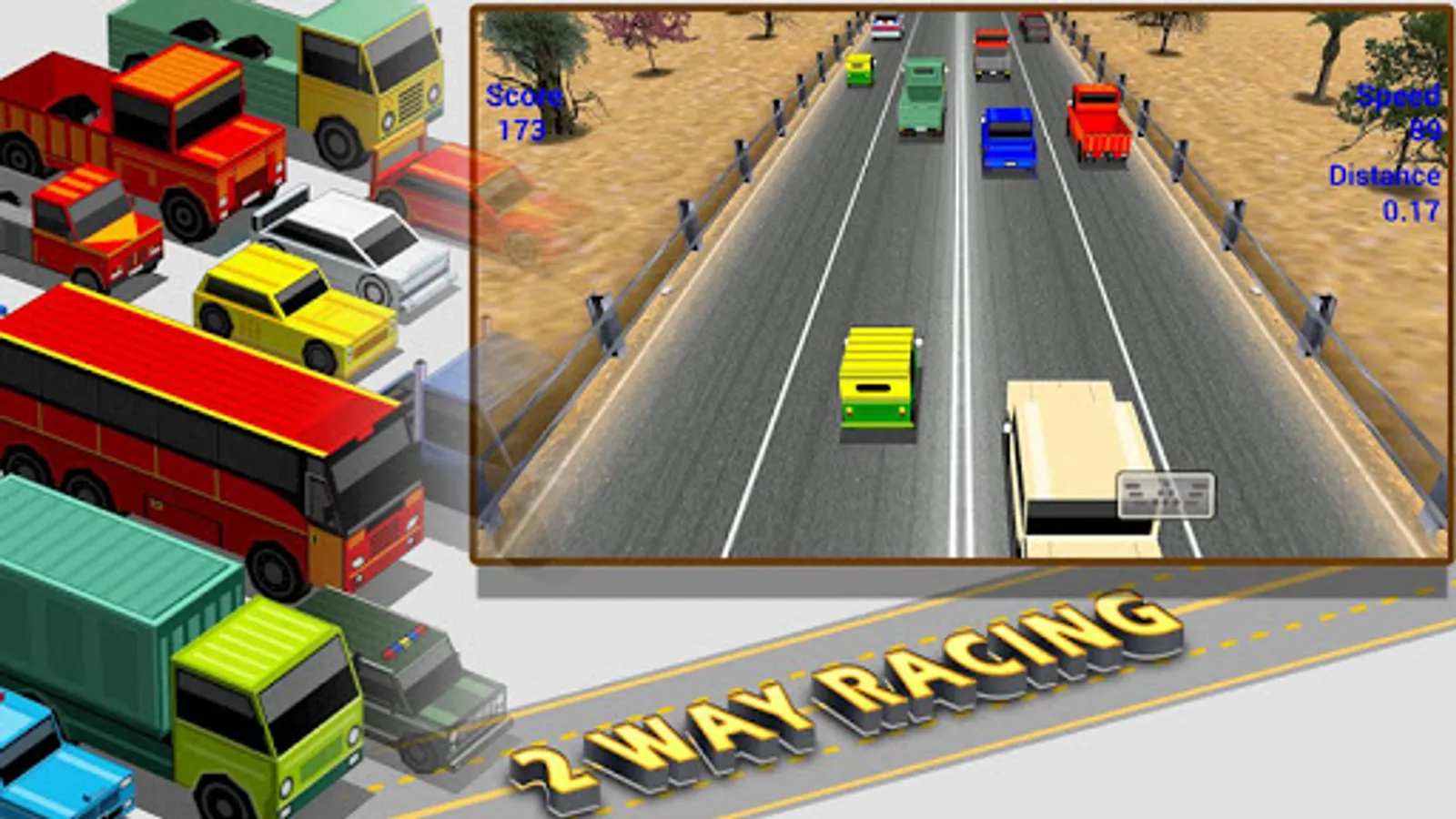 2Way Racing3d is one of the best endless racing game now available. Drive your car on the various location of the highway, get cash, buy new one car.