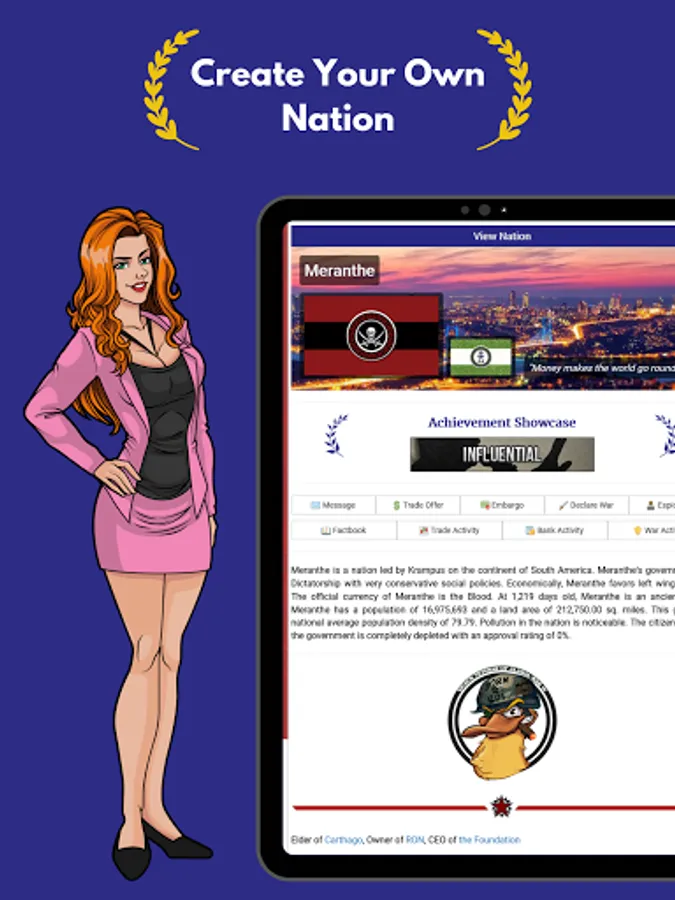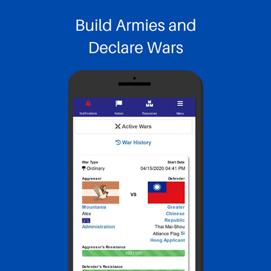 Raise armies and wage war with other players. With 7 different military units, including nuclear weapons, you can raid neighboring nations to loot money and resources or wage all out attrition war to pummel your opponents into the ground.