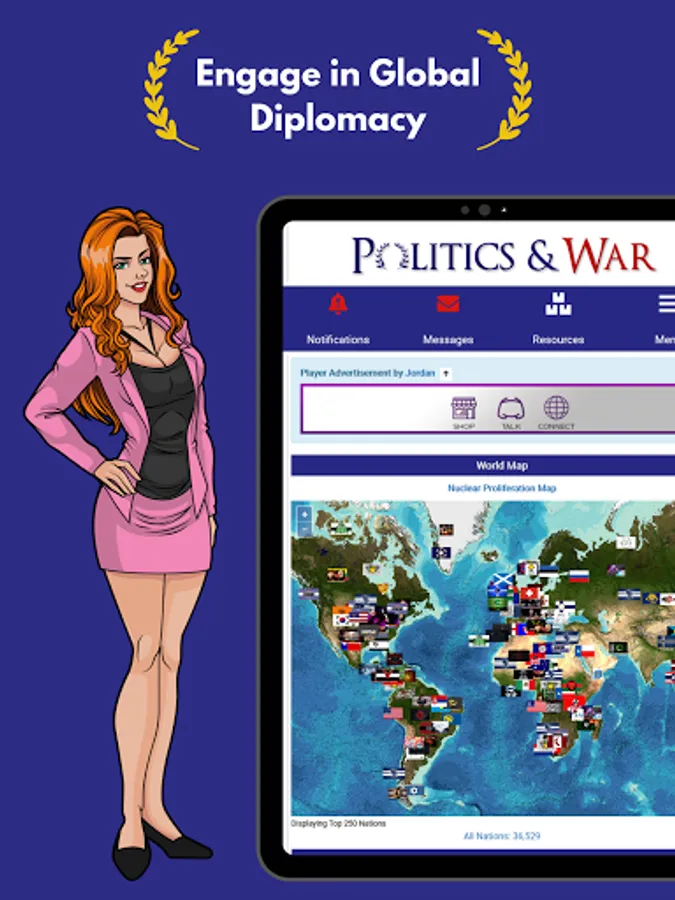 Engage in diplomacy with other nations by creating and joining alliances with other players. You can sign treaties, enforce political and economic sanctions, cooperate in global wars, and more. Work together with other players to compete for economic, militaristic, and diplomatic dominance in the game.