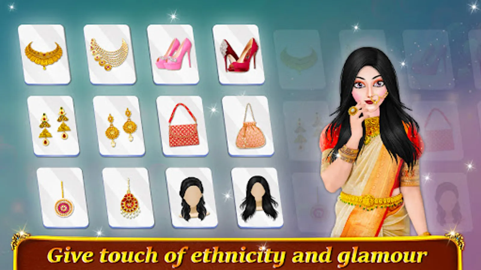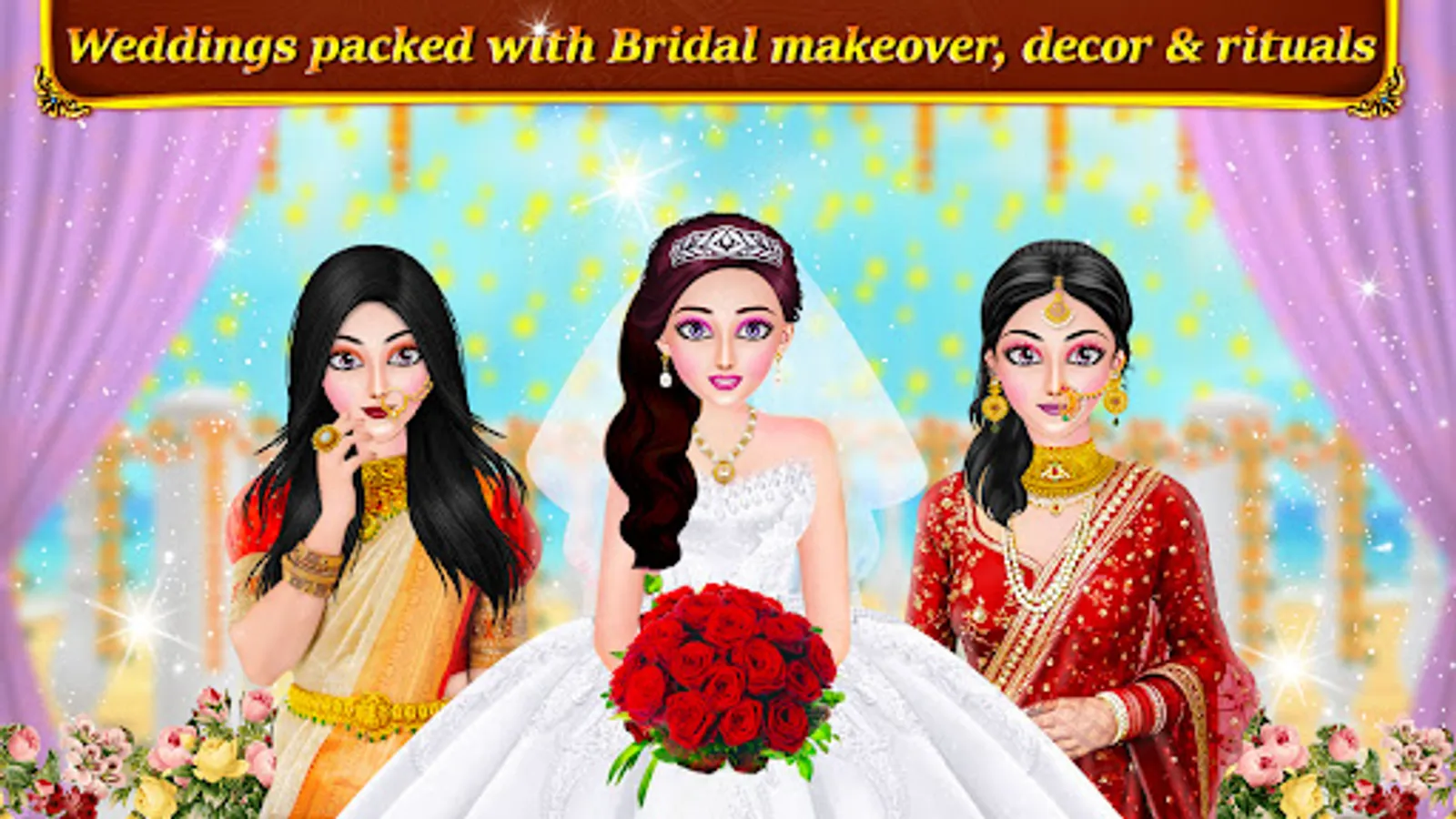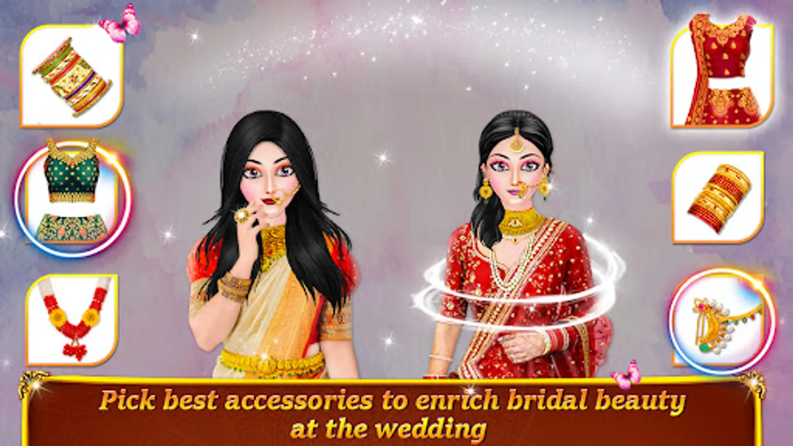Make sure your beautiful bride looks absolutely stunning in marriage pictures with Indian cosmetics, beautiful braid hairstyle, lots of accessories like necklace, nose rinds, bindi, earrings, high heels for a glowing look. Royal Bride looks more beautiful in unique hair color, eye shadow color, blush color, unique mascara color, shining and attractive lipstick colour, eyebrow style and eye ball color. Indian wedding salon games comes with tons of hair color and hair style for all wedding rituals like engagement, mehndi (henna), haldi, mandap and baarat welcome ceremonies. Stylist dress up & makeup creativity is must in designing dress and makeover brides. Princess wedding makeup game for girls offers super beauty makeovers for royal brides. Dress them up in real designer style with elegant and fancy Indian dresses, sarees, lehenga cholis and other sparkly accessories. Hindu and christian Indian wedding games with levels offers designing that dress up for rituals and ceremonies for pretty princess brides. Celebrate special wedding party day like stylish dream wedding in Makeup games & dress up fashion stylist Indian wedding games.