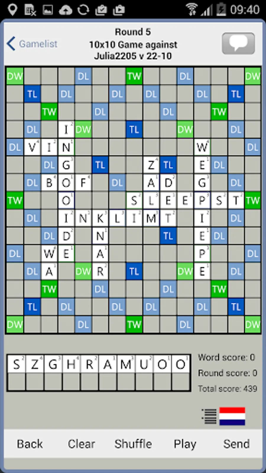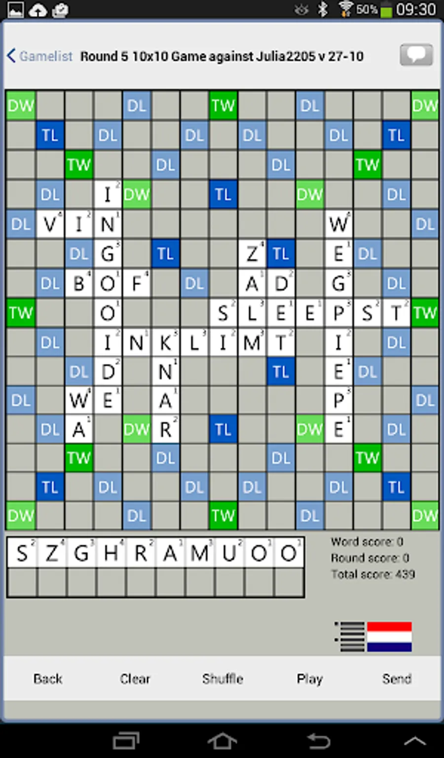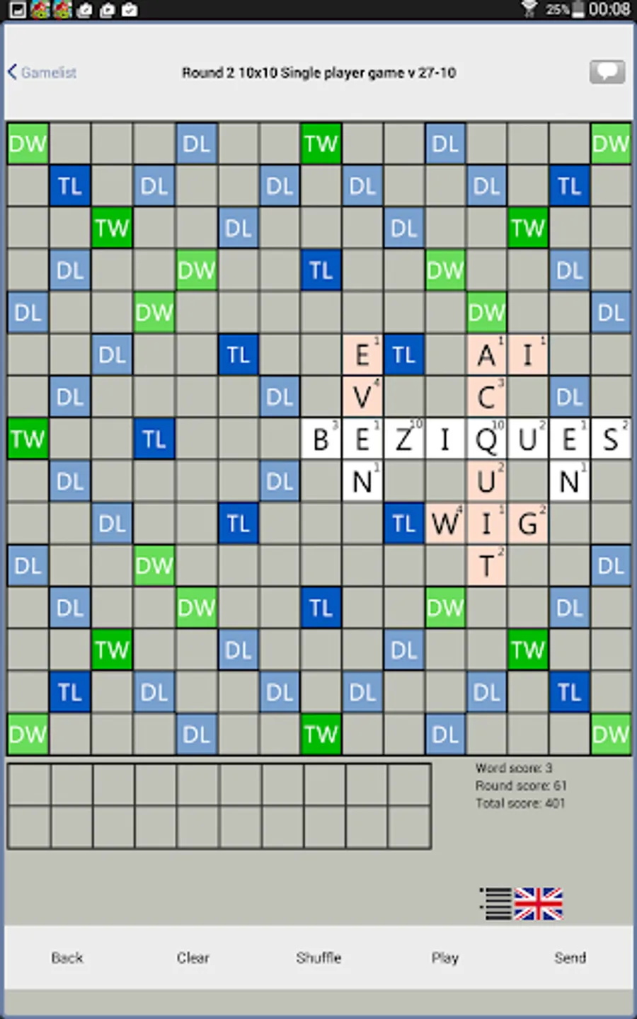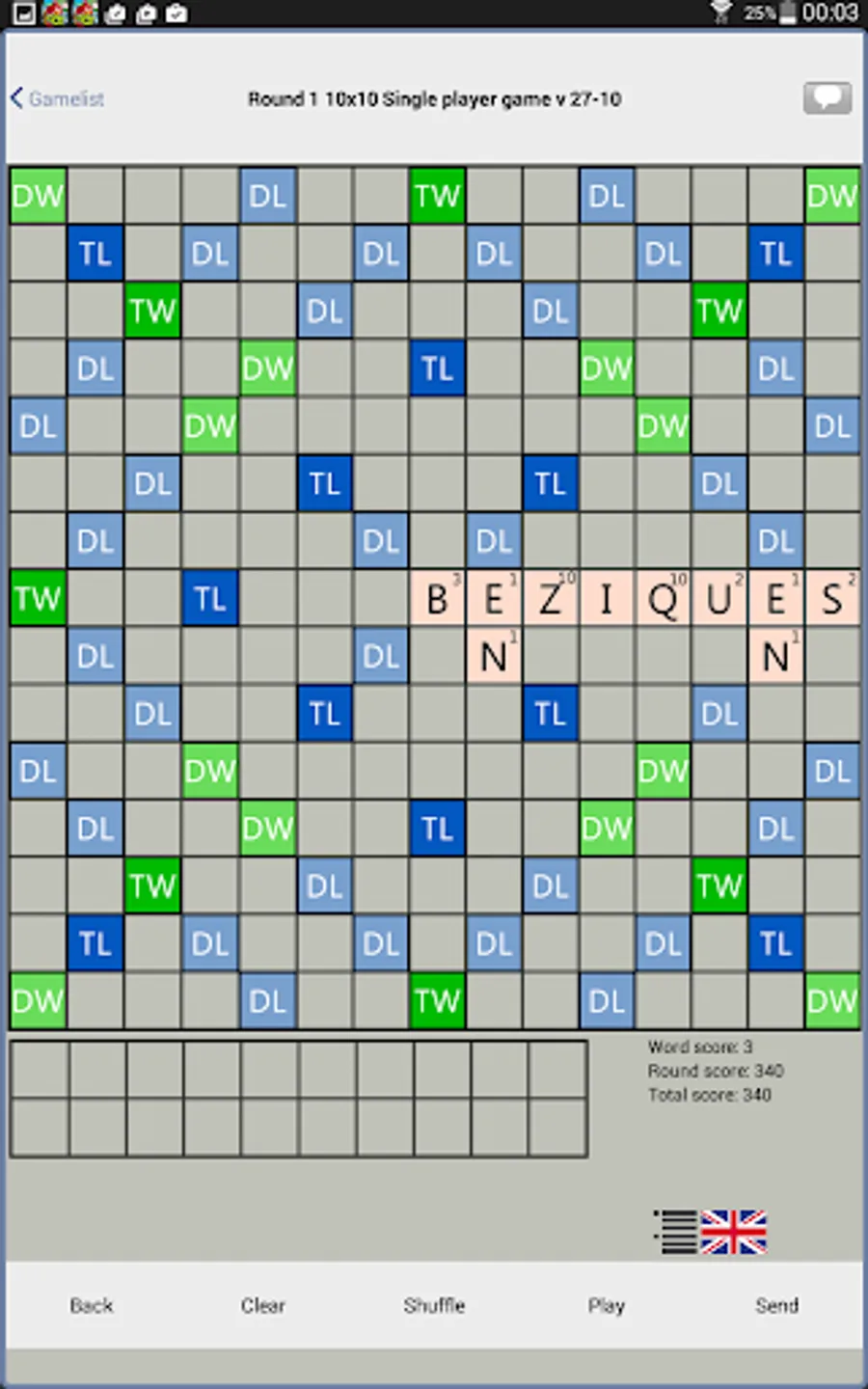 You can place the letters horizontally or vertically in one round. You can always change your word during the same round. If your opponent also has finished this round, you can see the board of the opponent with the score and you will receive again new letters, of course each player the same letters.