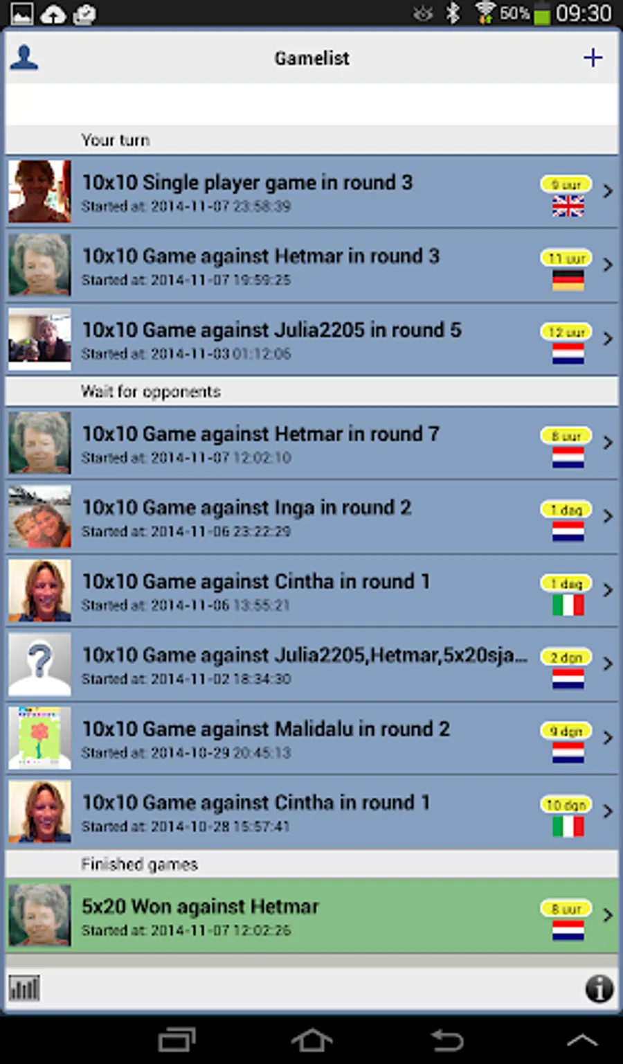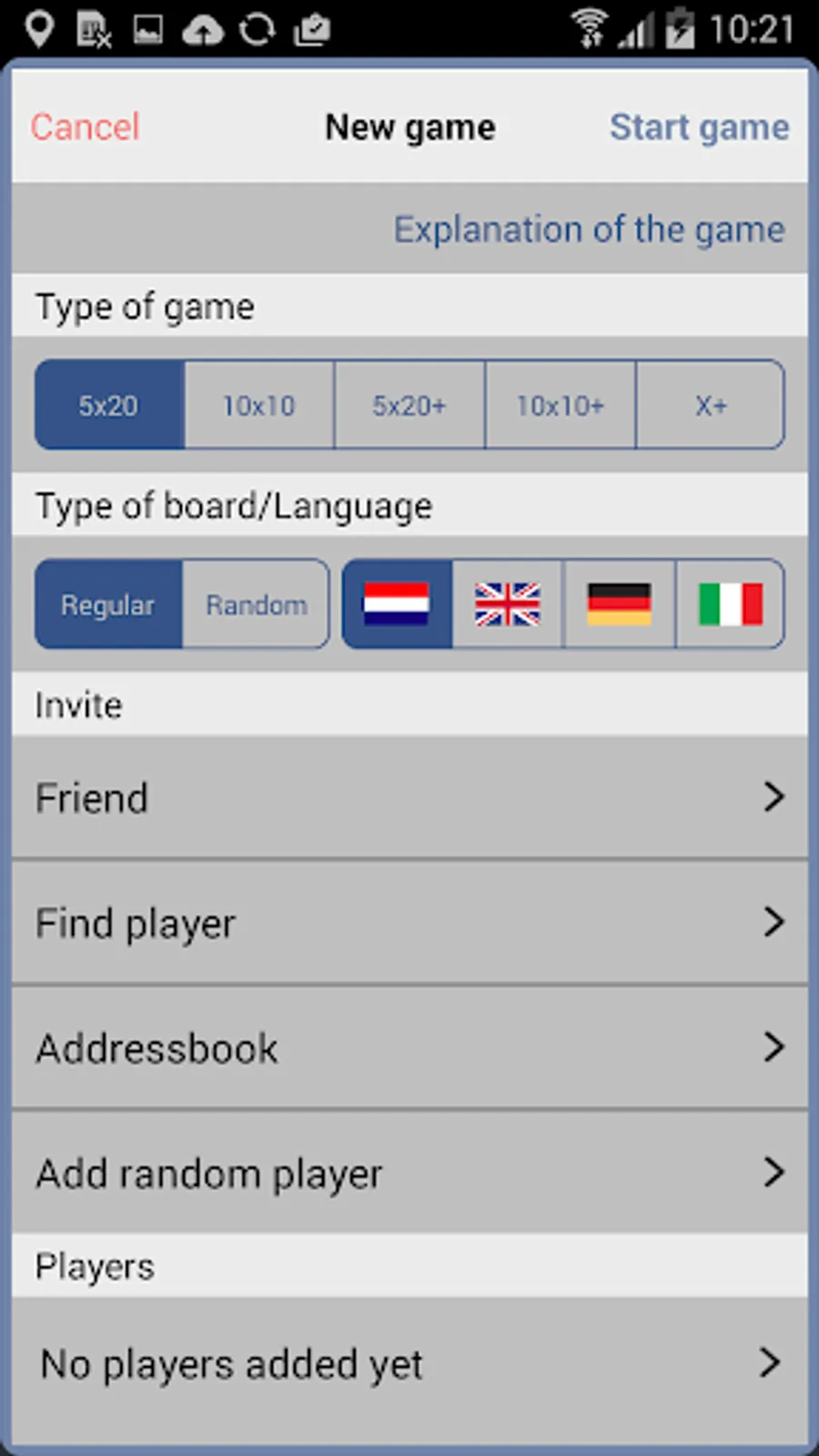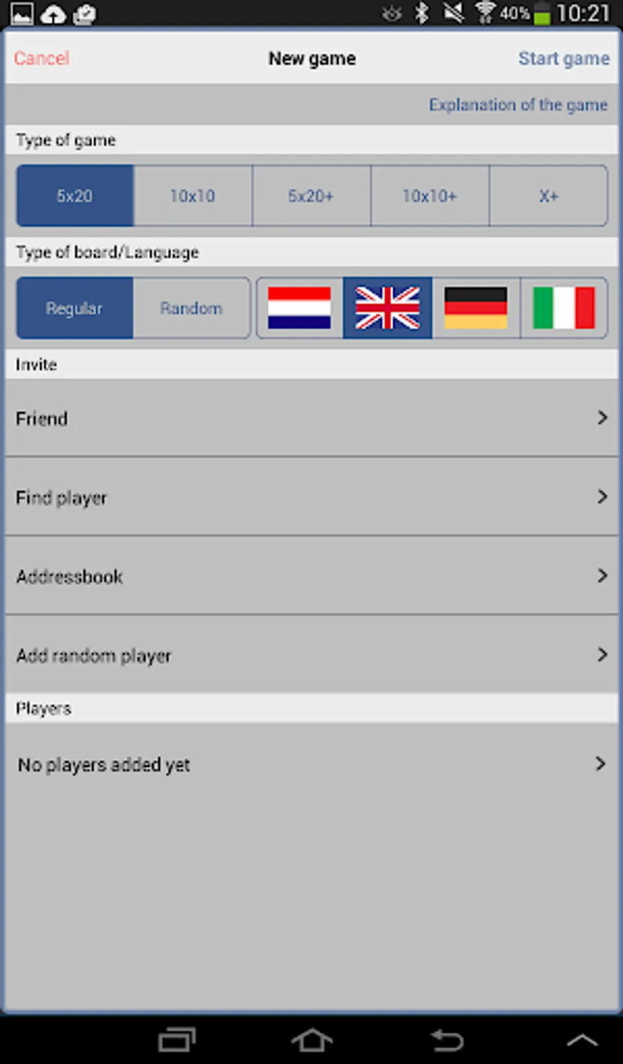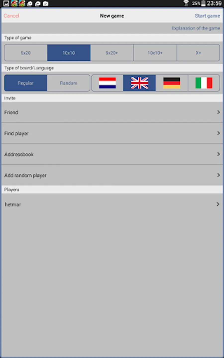You can place the letters horizontally or vertically in one round. You can always change your word during the same round. If your opponent also has finished this round, you can see the board of the opponent with the score and you will receive again new letters, of course each player the same letters.