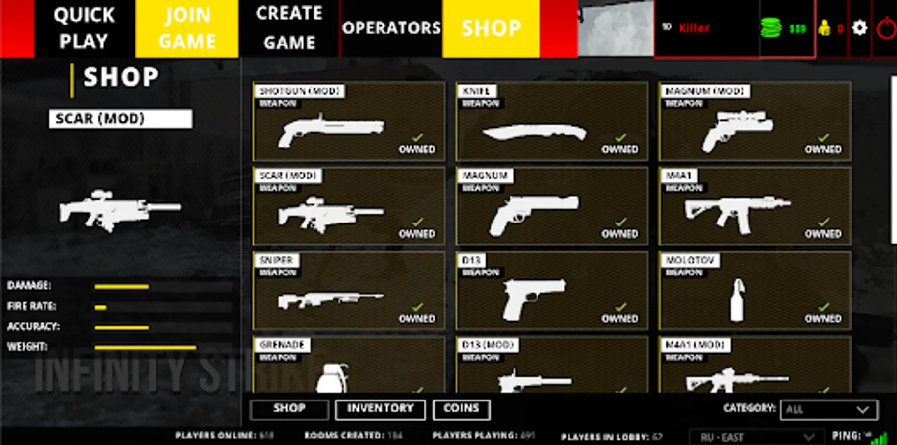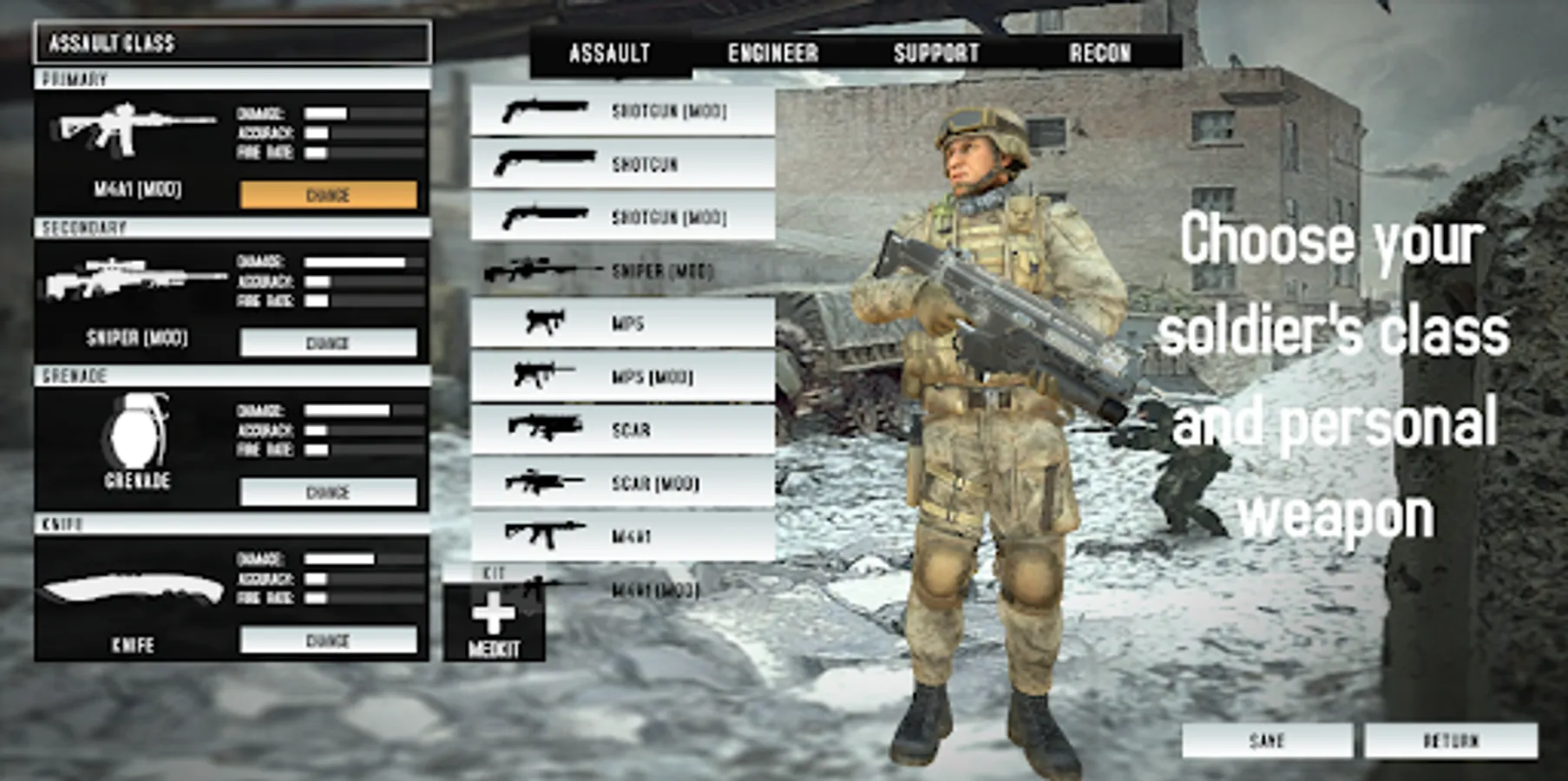 If you want to prepare for multiplayer or are not connected to the Internet, you can play in single player mode with bots. The enemy in single player mode is tactical AI soldiers. Collect cash coins to increase and upgrade your weapon inventory. Once you upgrade your weapon, you can use it fully charged in both single and multiplayer modes. Weapons inventory consists of various types of weapons. Weapons can be upgraded with various sights, optics, and silencers.
