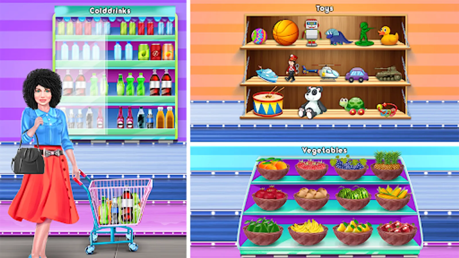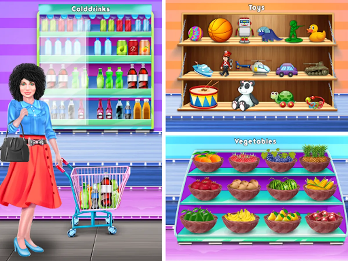 This supermarket has a lot of sections: A Toy Zone Family Game, Supermarket Shopping Mall, cash register, clothing stores, boots High heels design , Nail artist,departments for grocery, fruits, and vegetables,supermarket fruits, sweets, and toys, a recycling area, and others. Do all the necessary tasks and provide superb shopping services to meet your customers’ needs.