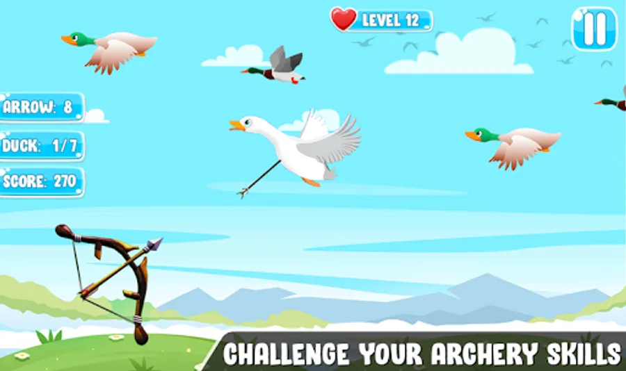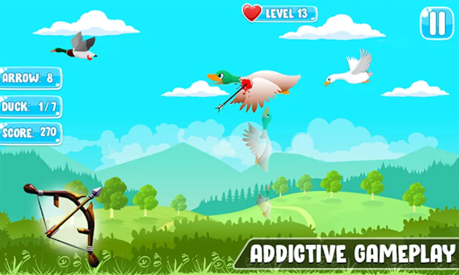 Real Duck shooting Archery game has arcade duck shooting mode and endless duck shooting mode. Pull the rope of bow, release arrow and shoot ducks with your arrow in this amazing duck hunting 2D game and experience real duck hunting 3D experience. Become an Archery Master. If you are a real hunting and shooting fan, pick up the bow and become an arrow hunter in this amazing duck hunting game. Enjoy waterfowl hunting in some beautiful scenery and hunt down flying ducks, with use of bow and arrows; show how good your Archery skills are.