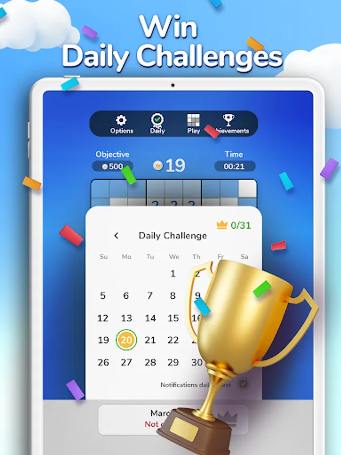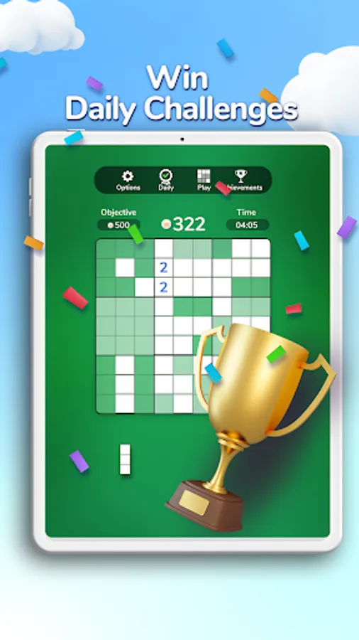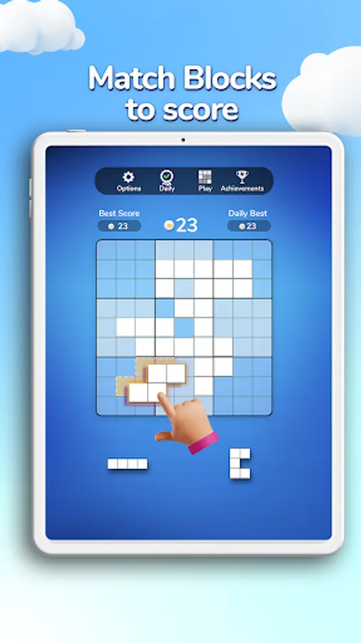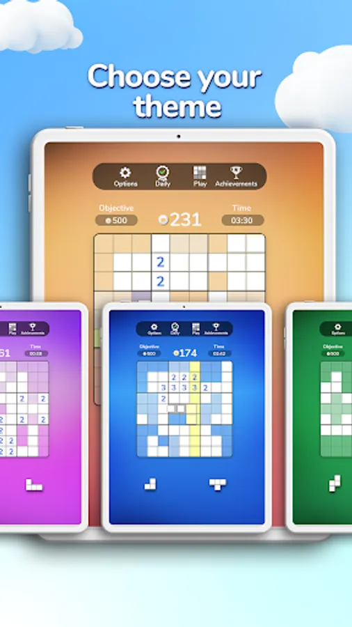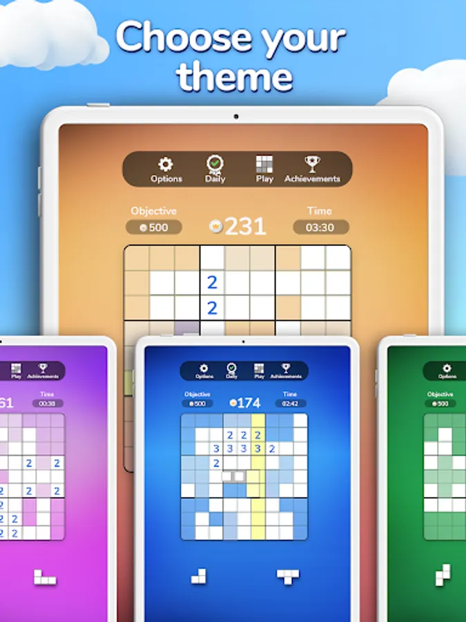 To play, drop the blocks on the 9x9 grid, filling up lines and squares to keep the board clean. You can complete daily challenges or simply play freely to beat your high score. The game allows you to remove several elements at once to make a combo and make several successful moves in a row to get a streak. Moreover, you can customize the game with a theme of your choice.