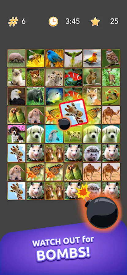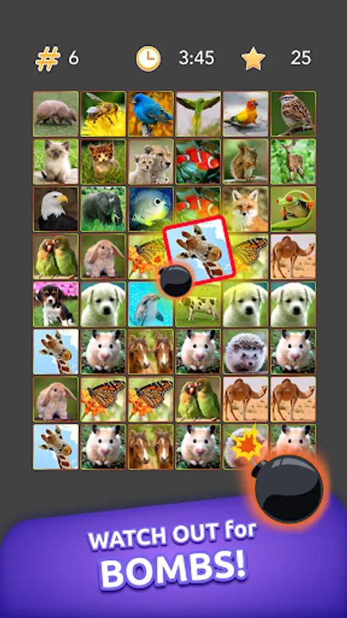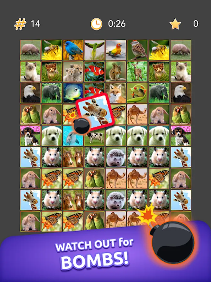 Find two IDENTICAL IMAGES hidden on board and tap on tiles to connect.
