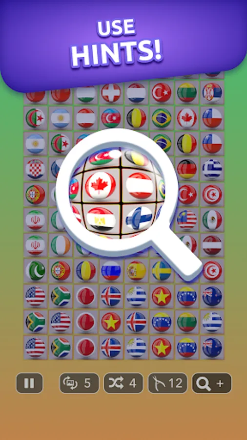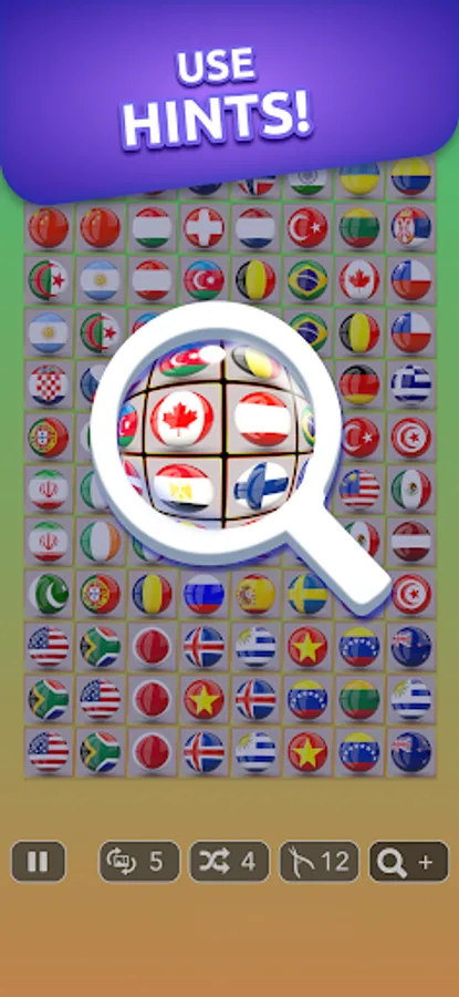 Use the HINT button to reveal a connectable pair. Use the SHUFFLE button to rearrange tiles.
