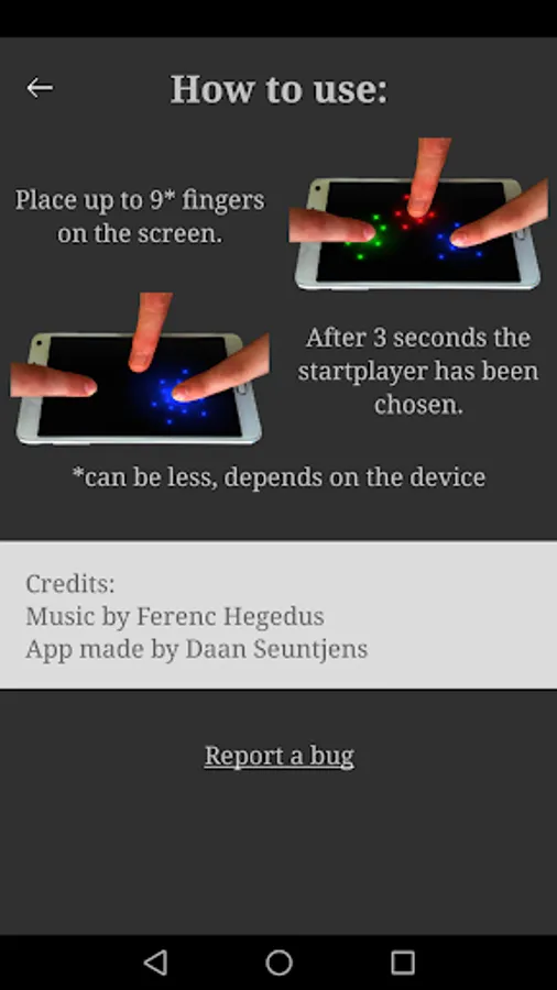 Put your fingers on the screen for 3 seconds to randomly select a start player. For up to 9 people.
