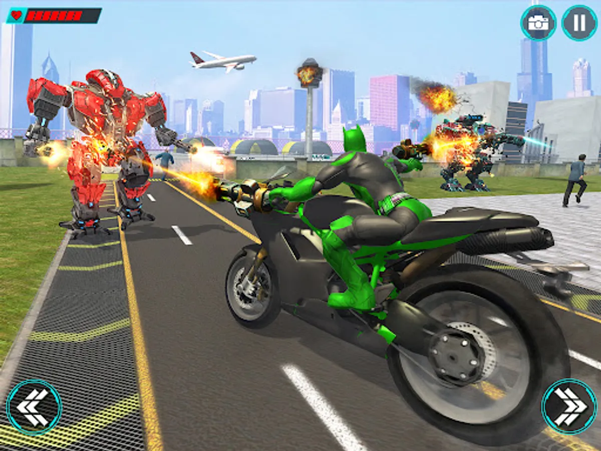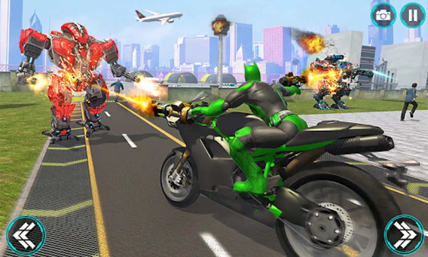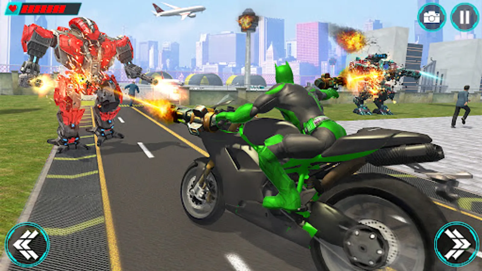 Defeat Speed Heroes to fight evil robots and end future robot wars in real robot transformation games. The robotic motorcycle turns into a flying police bat hero to save the urban match warriors from crime heroes. U.S. police have released vicious robots and lost control of the city. The city needs a flying robot to bring down criminal robots to maintain peace and the rule of law. The mayor called on the superhero team's special forces to shoot him with sophisticated weapons and robotic guns. You may have played auto robot transforming games, but this is one of the best robot transforming games in flying robot games. Features a futuristic motorbike that fights evil robots against a robot bike superhero attack. Experience the action-packed game in the best flying robot games with Bike Transform Racket to defeat the Combat Robot Bike Hero in Robot Bike Superhero Games.