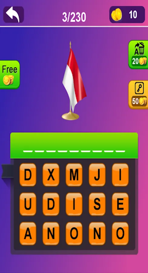 This world flag quiz is in Indonesian. The game that guesses the name of the flags of countries in the world. There are around 230 flag names in this game. Each level has a picture of the flag of a country, your job is to guess which country's name the flag comes from.