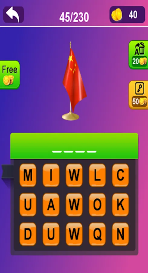 The first time you play this flag quiz game you will get 100 points for free. Each open answer required 50 points. If you have difficulty guessing the name of the country, you can use the help feature that has been provided.