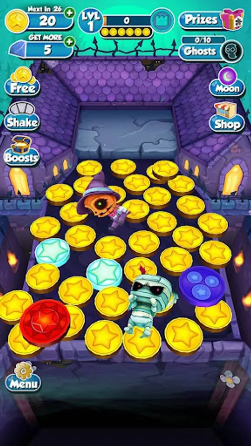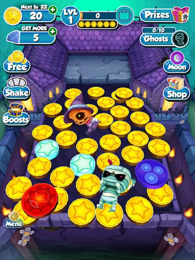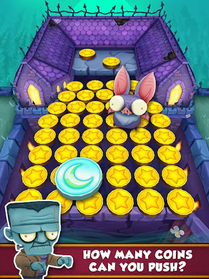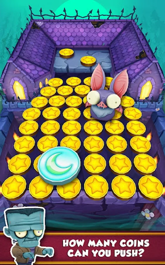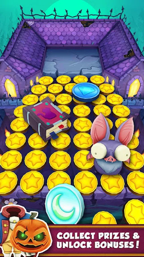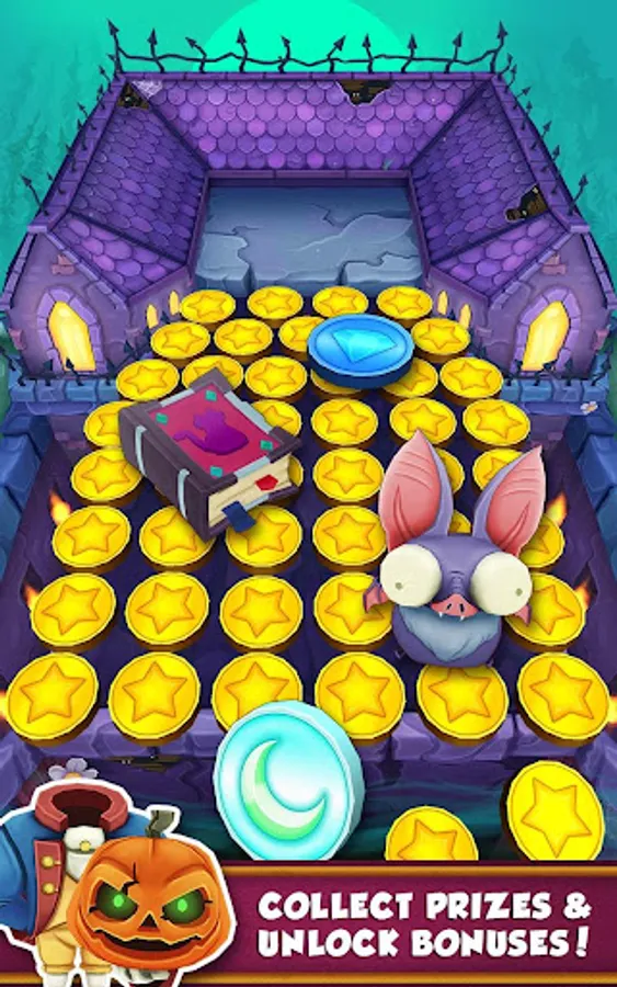 Drop gold coins onto the Halloween themed pusher, then doze them into a pile and over the edge to collect. Shake the machine to release bats and earn even more coins quickly. Special coins appear and provide you with a helpful boost, including the new ghost coins and moon coins! Collect the prize and puzzle piece collectibles that spawn on the machine board to complete prize lines and unlock bonuses! Come back daily to spend your regenerated coins!