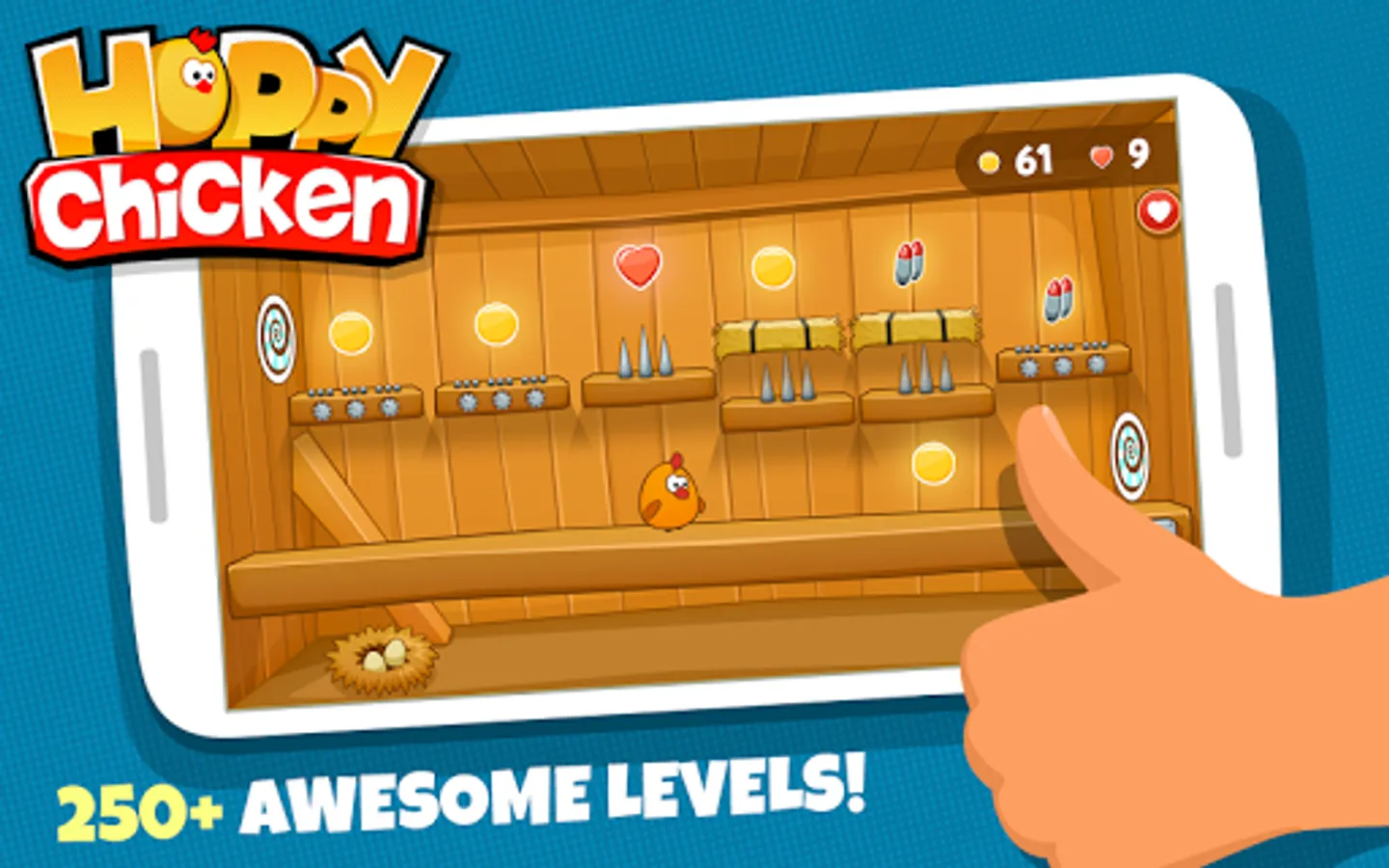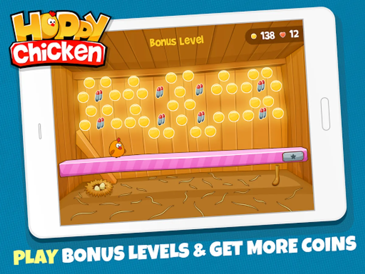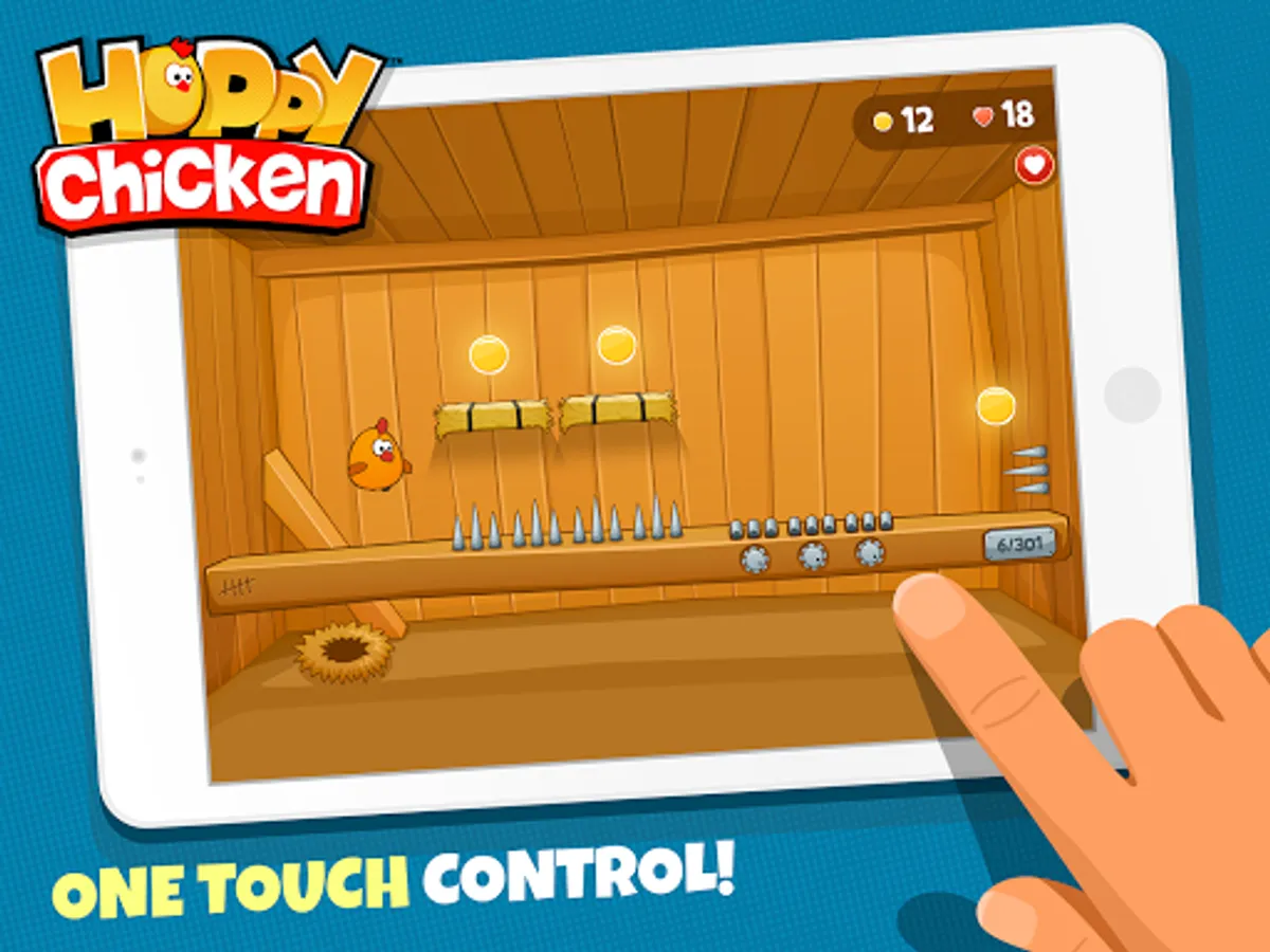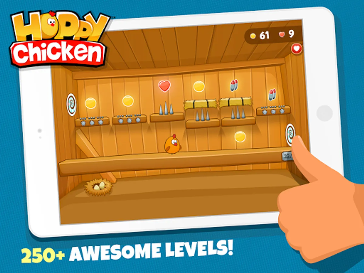 Download the game and put your brain to work! Enjoy over 300 challenging and engaging Hoppy Chicken Levels. Keep hopping as you control the chicken with a single finger to avoid obstacles and collect the yolks. Happy hopping!