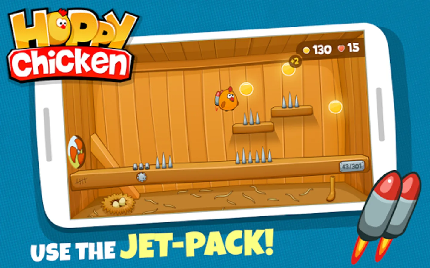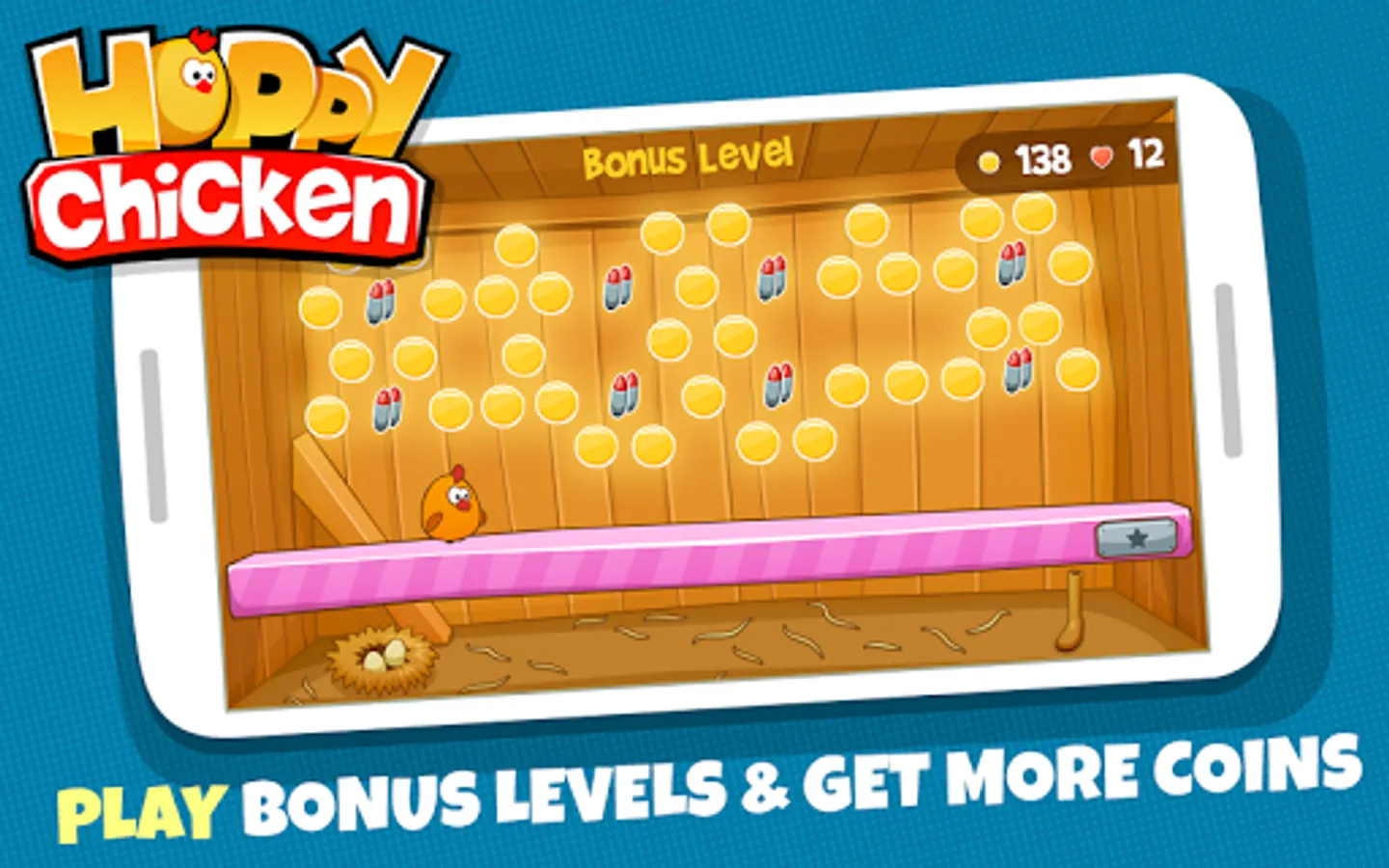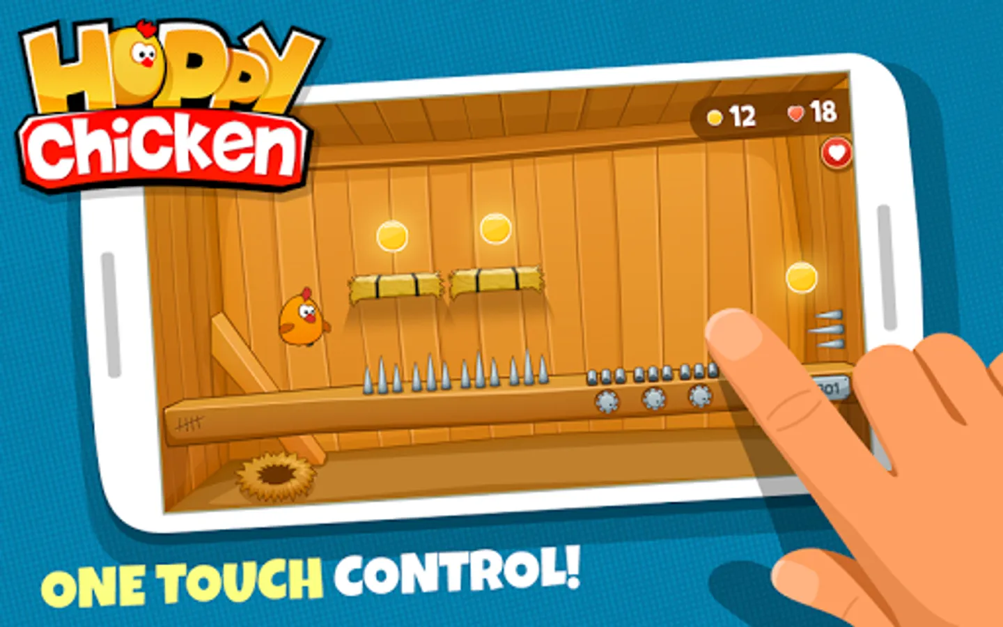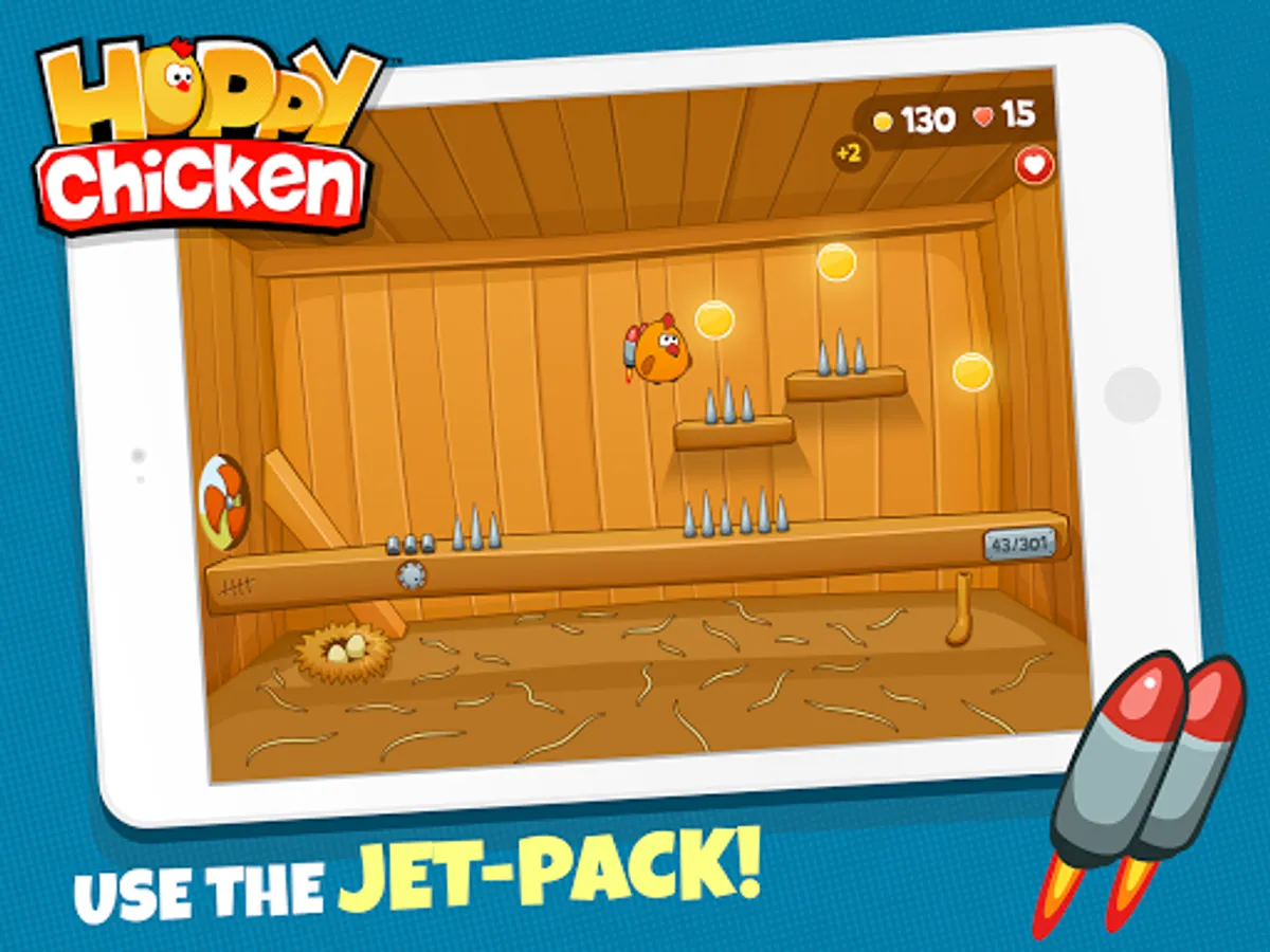 Download the game and put your brain to work! Enjoy over 300 challenging and engaging Hoppy Chicken Levels. Keep hopping as you control the chicken with a single finger to avoid obstacles and collect the yolks. Happy hopping!