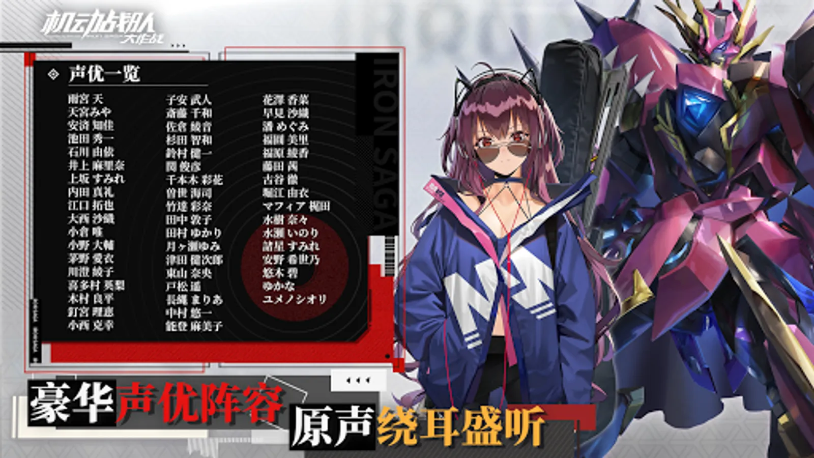 Make games with sincerity and make music with heart. We specially invited the well-known composer and arranger Mr. Sawano Hiroyuki (representative works: Mobile Suit Gundam UC, Guilty Crown, Attack on Titan, etc.) to play OP, ED, BGM soundtrack, famous animator, animation supervisor, mechanical designer Ding Shi [Da Zhang Zhengji] (representative works: 弾婷凤, Super Robot Wars, Gundam build series, Iron-Blooded Orphans and other animations) is in charge of machine design and PV animation supervision.